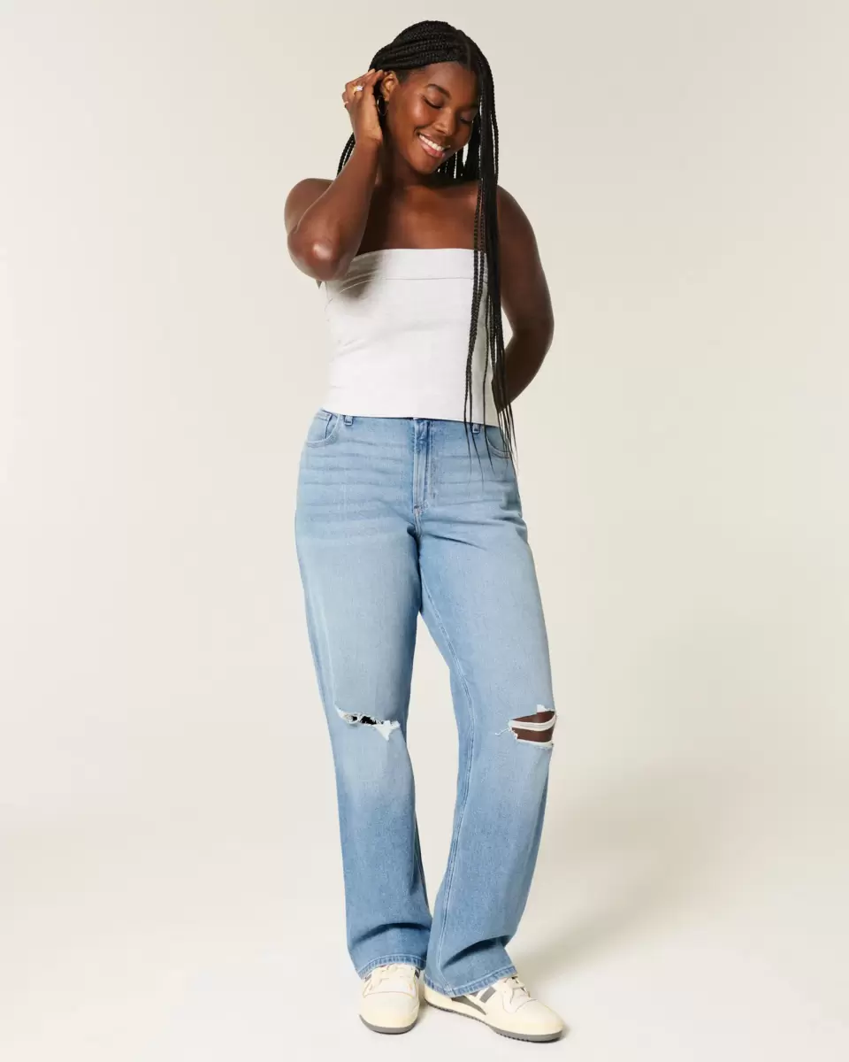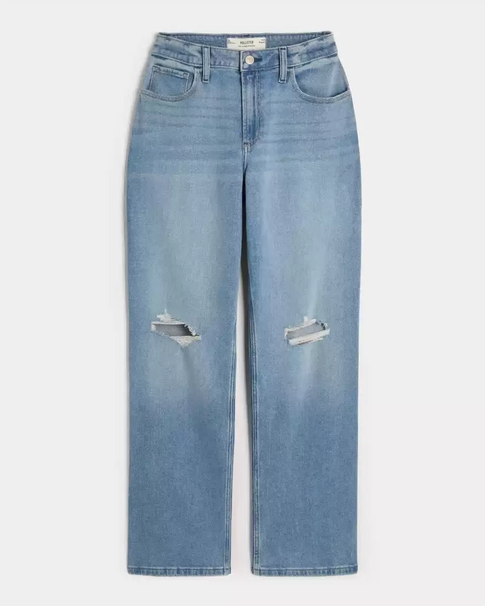 These comfy jeans are designed with a high-rise waist and relaxed leg. Medium wash, fading, whiskering, ripped details. Imported.