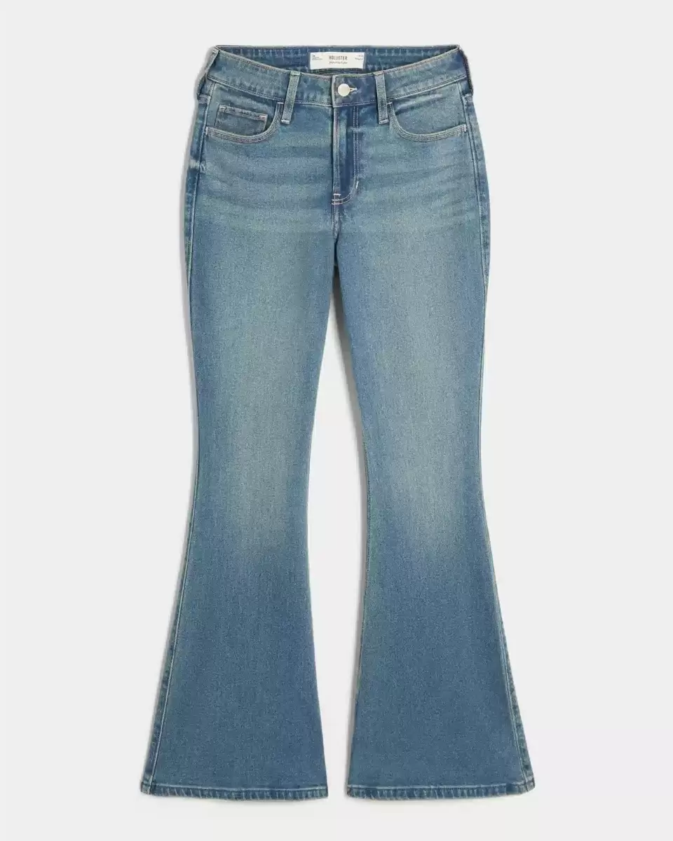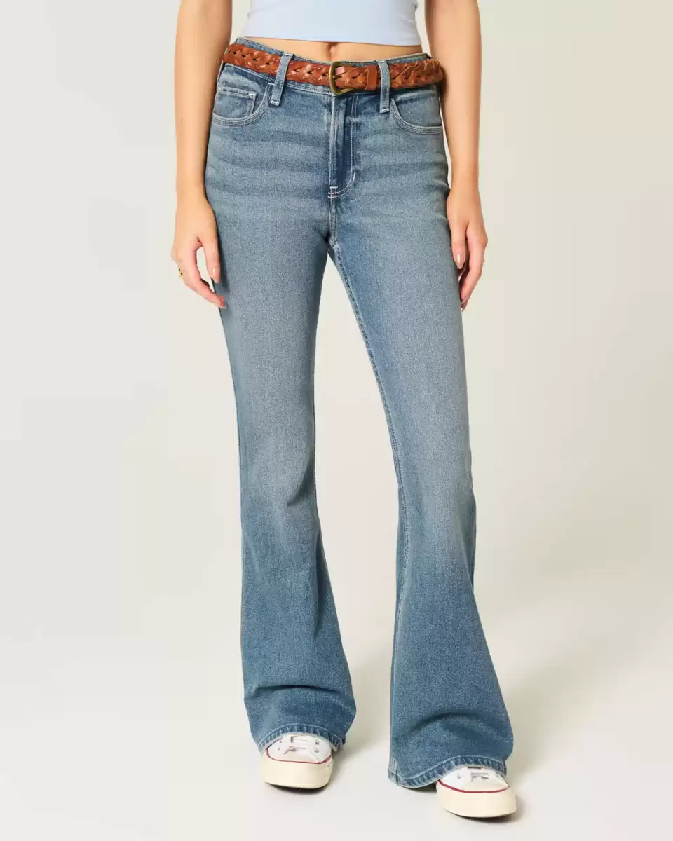 Comfortable denim jeans in a medium wash, designed with a flattering high-rise waist, slim leg and flared hem. Fading, whiskering, Vintage Stretch denim. Imported.
