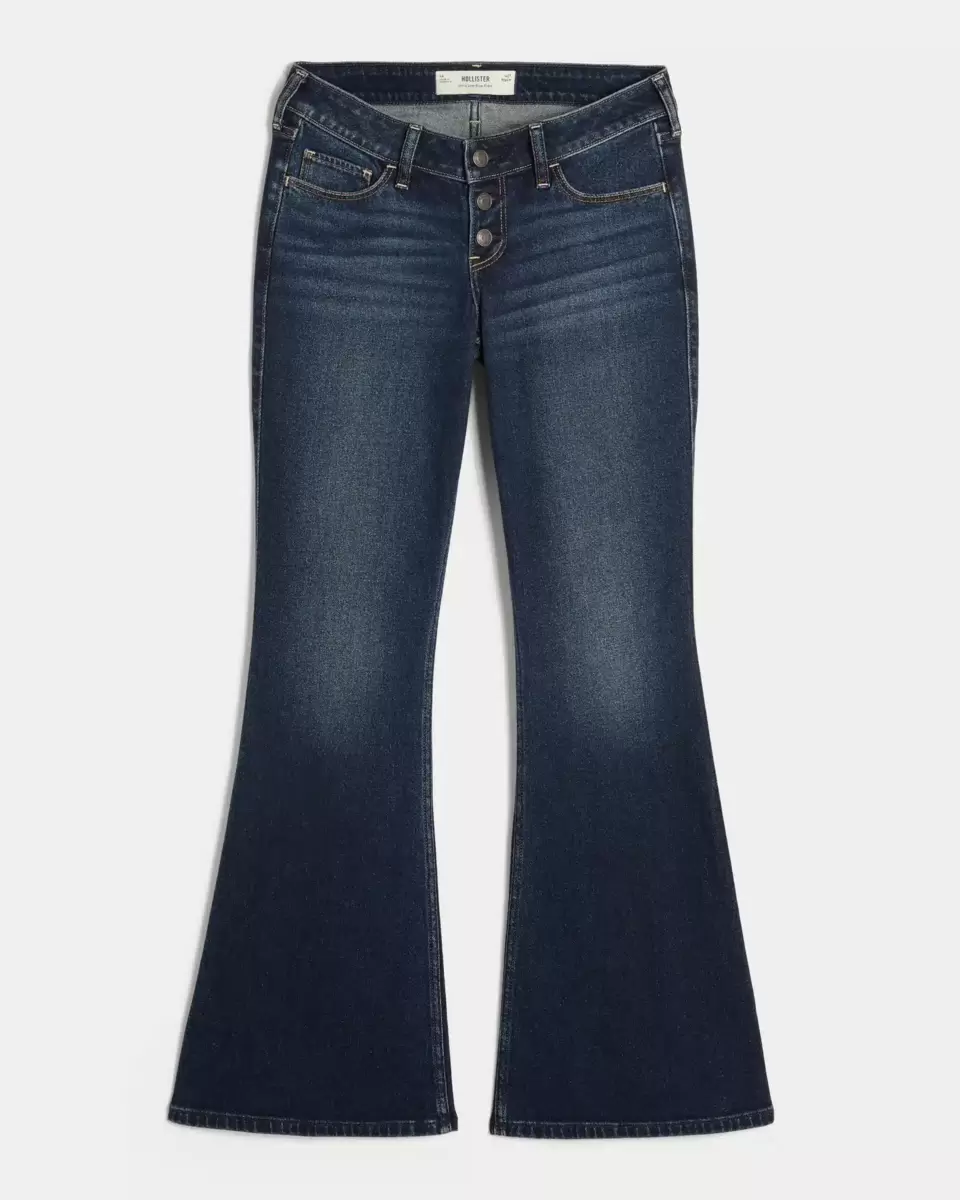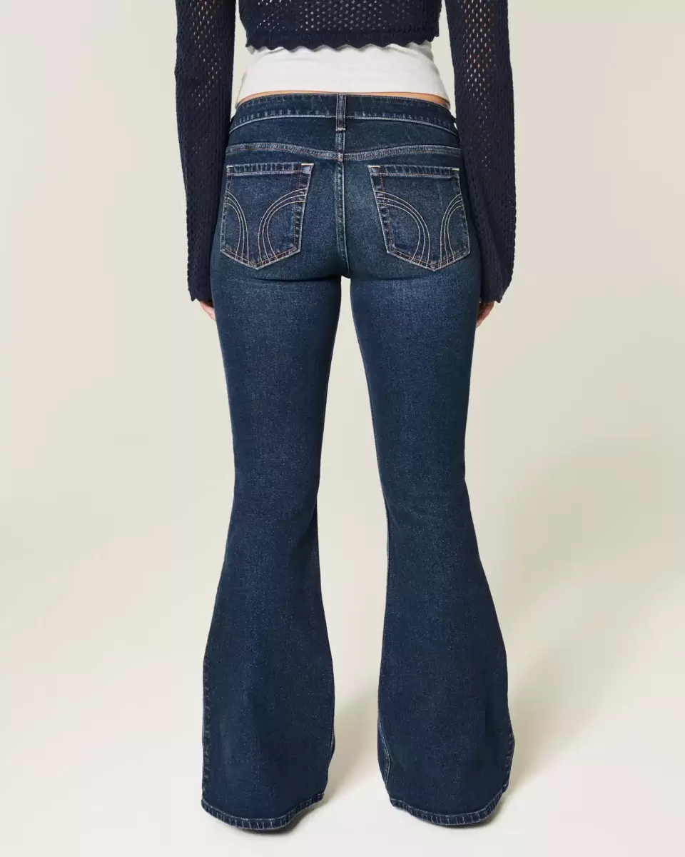Comfortable jeans in Vintage Stretch denim, designed with an ultra low-rise waist and flared hem. Dark wash with fading and whiskering. Imported.