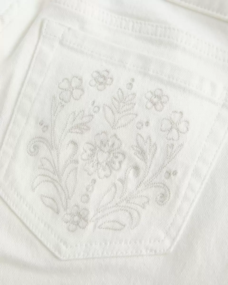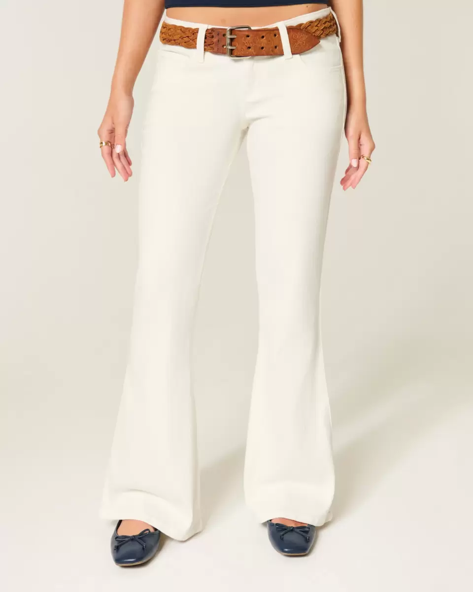 Comfortable jeans in Vintage Stretch denim, designed with an ultra low-rise waist and flared hem. Embroidered back pocket pattern. Imported.