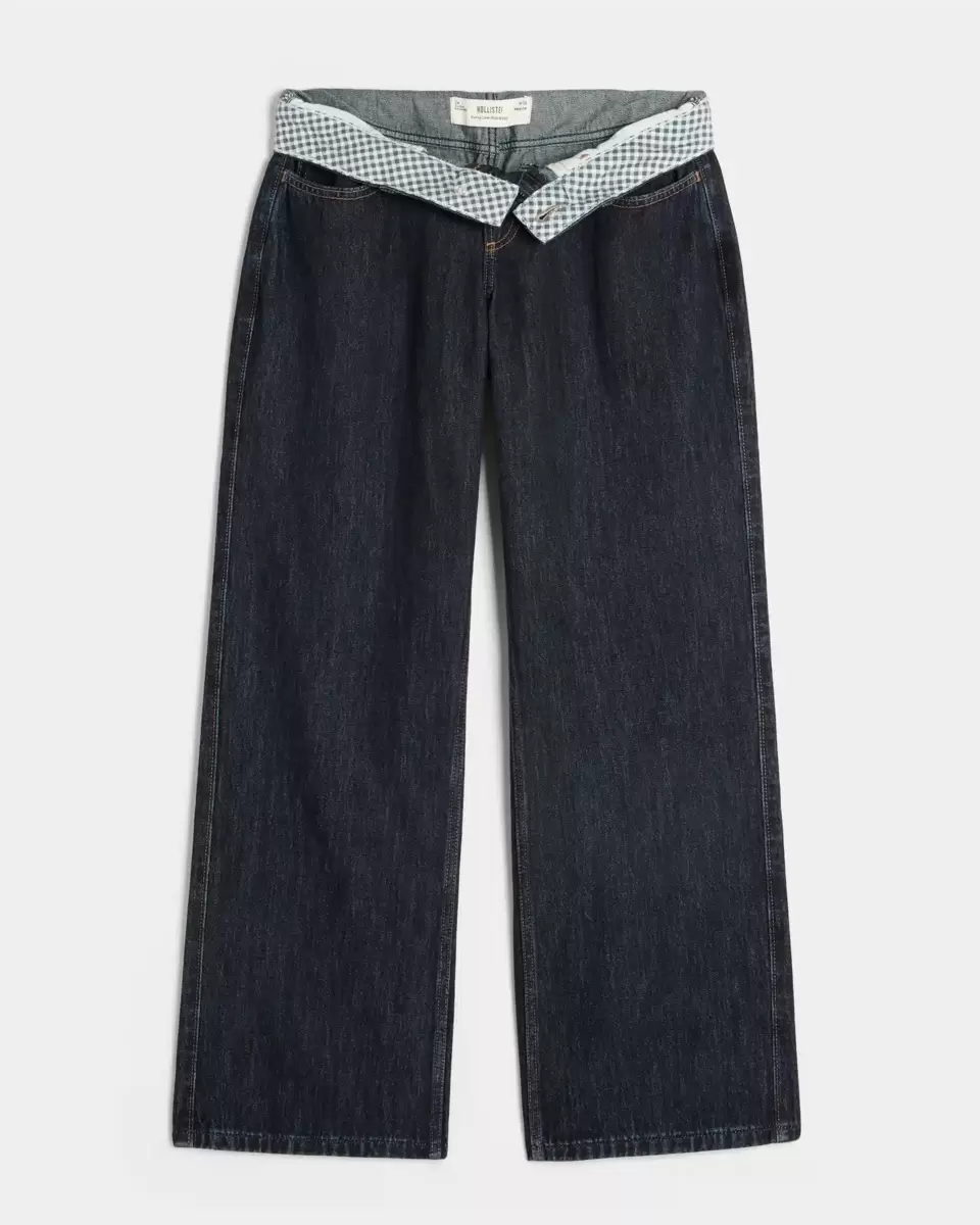 Comfortable denim jeans designed with a low-rise foldover waist with interior pattern, baggy leg, dark wash. Imported.