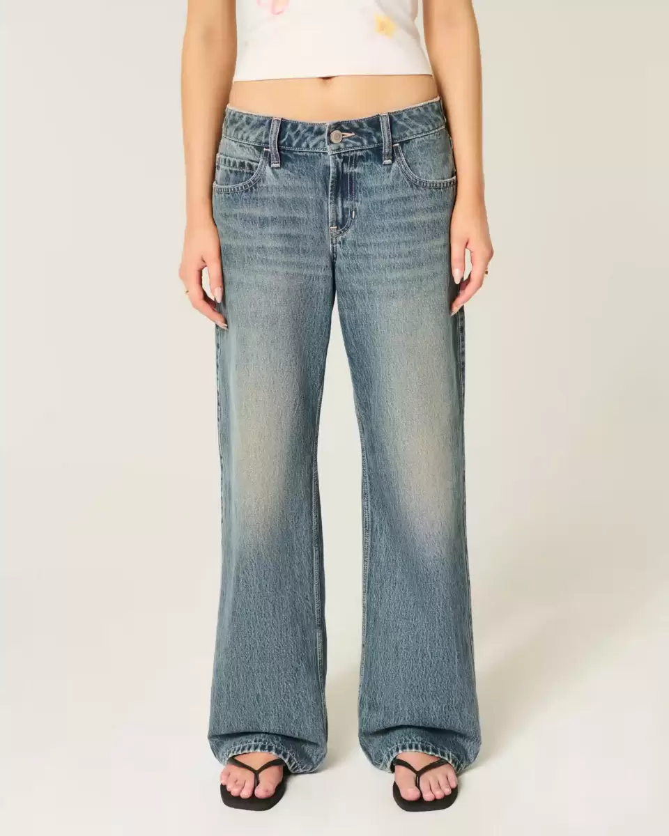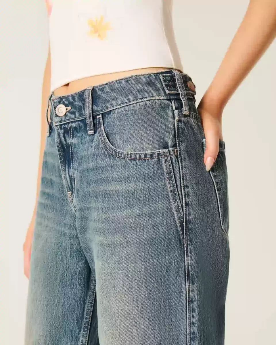 Comfortable denim jeans designed with an adjustable low-rise waistband and baggy leg. Medium wash, fading, whiskering. Imported.