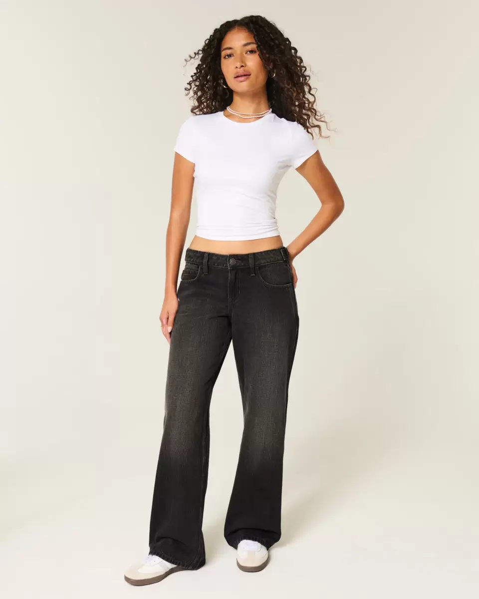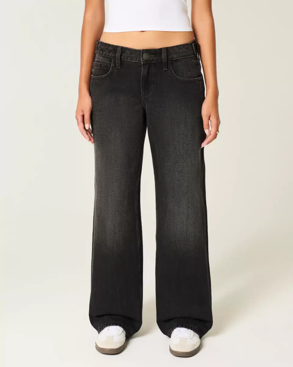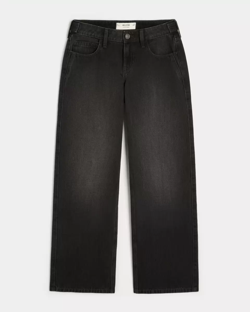 Comfortable denim jeans in washed black, designed with an adjustable low-rise waist and baggy leg. Fading. Imported.
