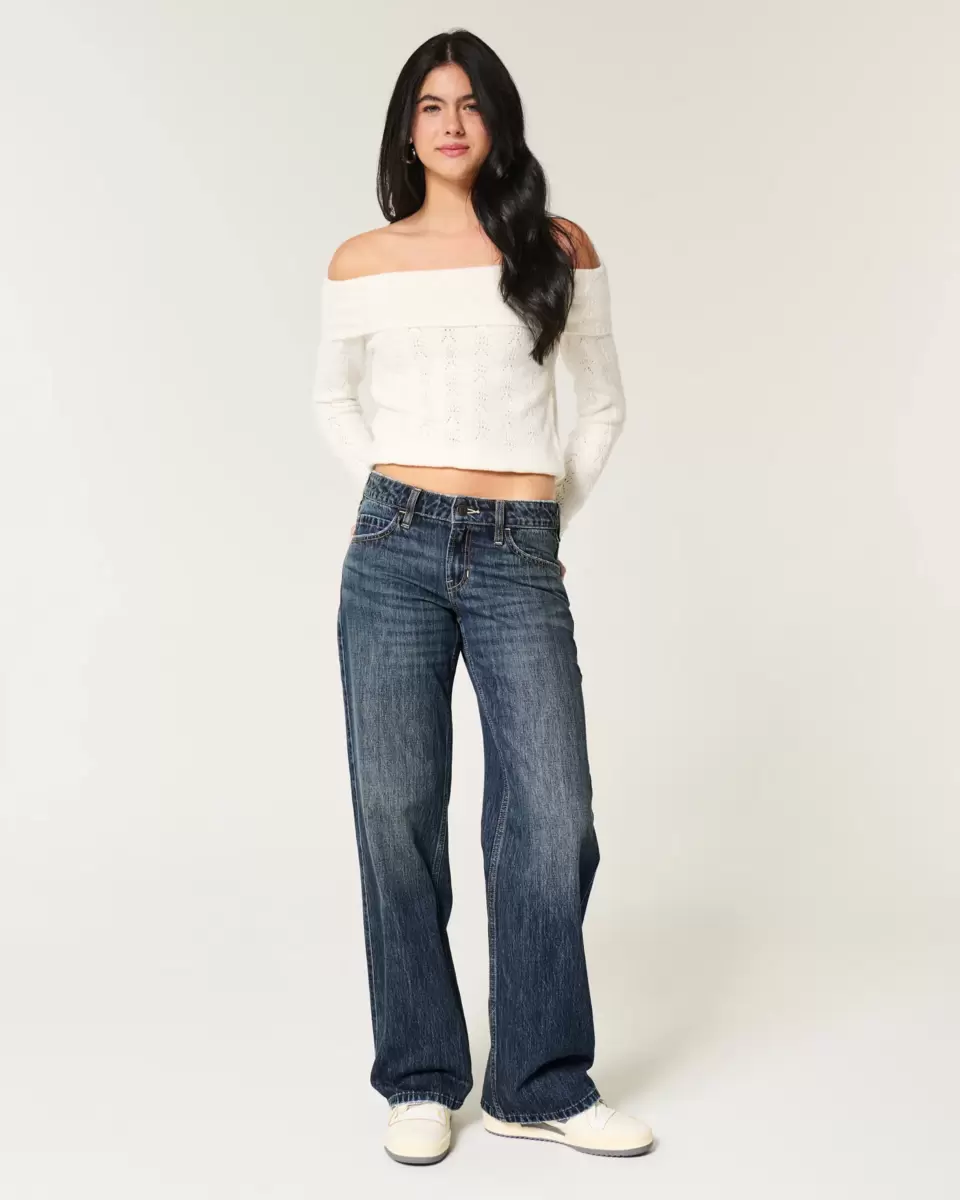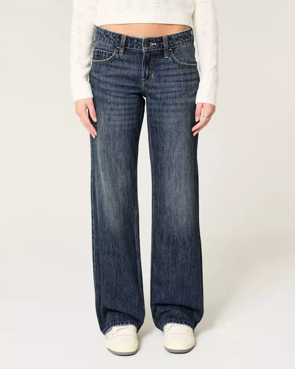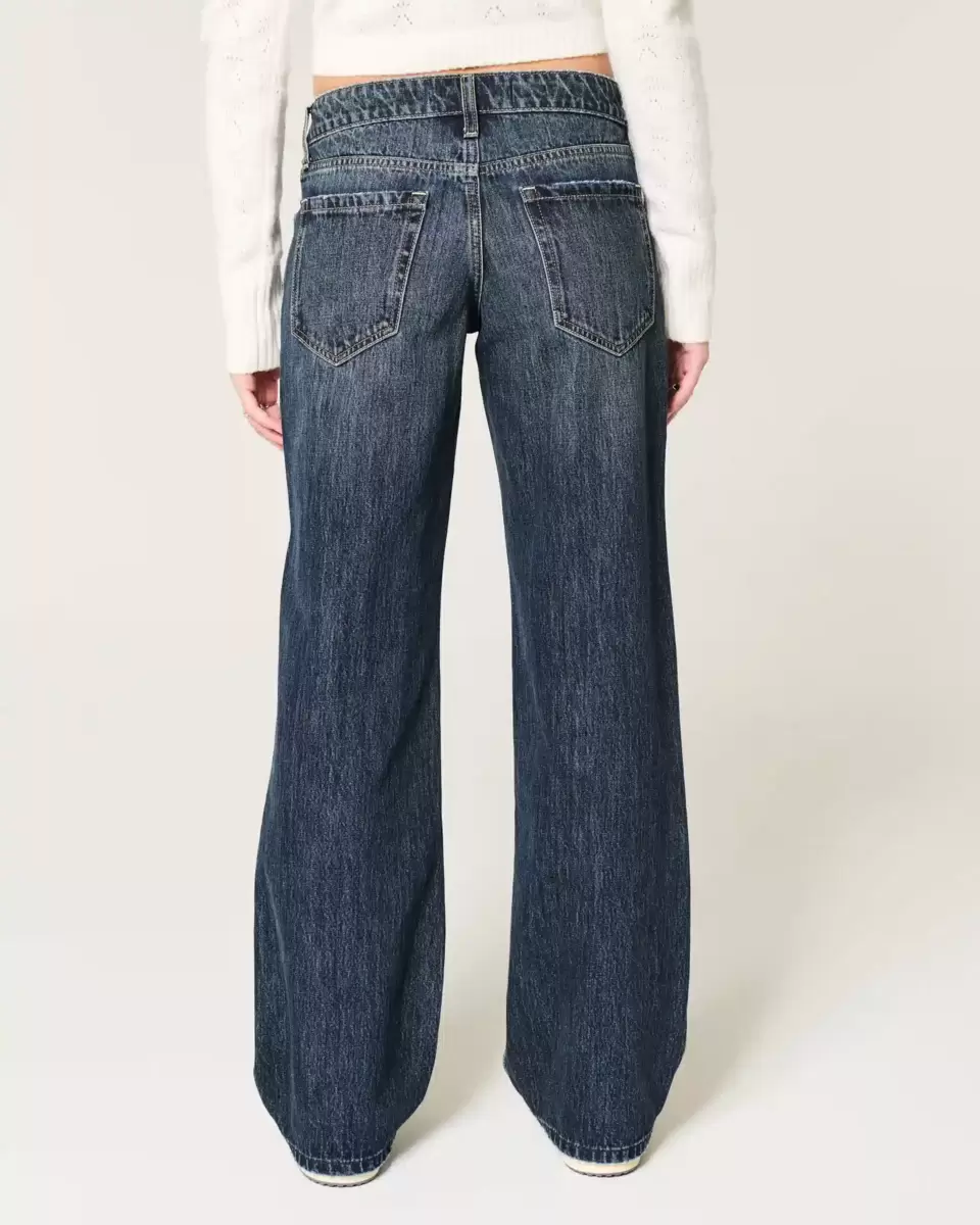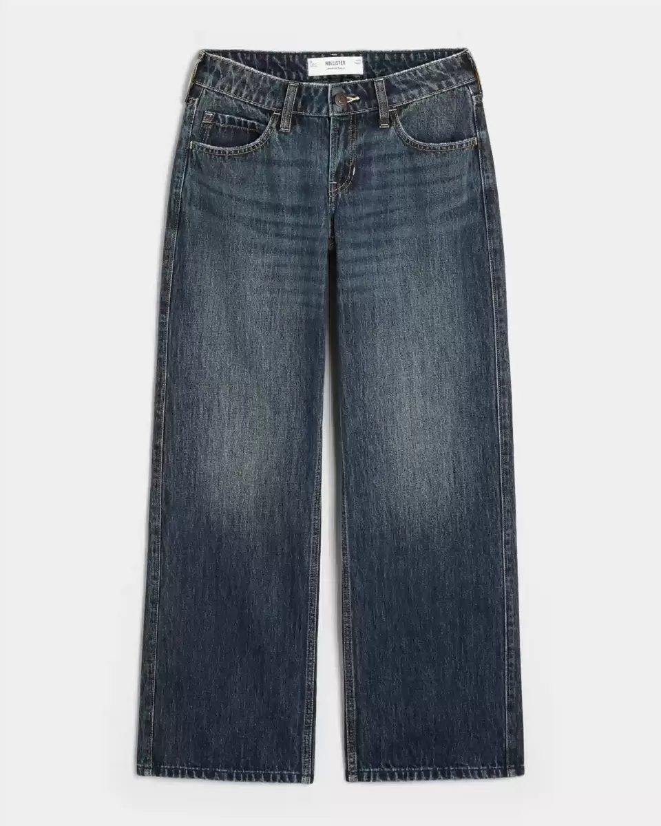 Ultra-comfortable denim jeans in a dark wash with fading and whiskering. Flattering low-rise waist, baggy leg. Imported.