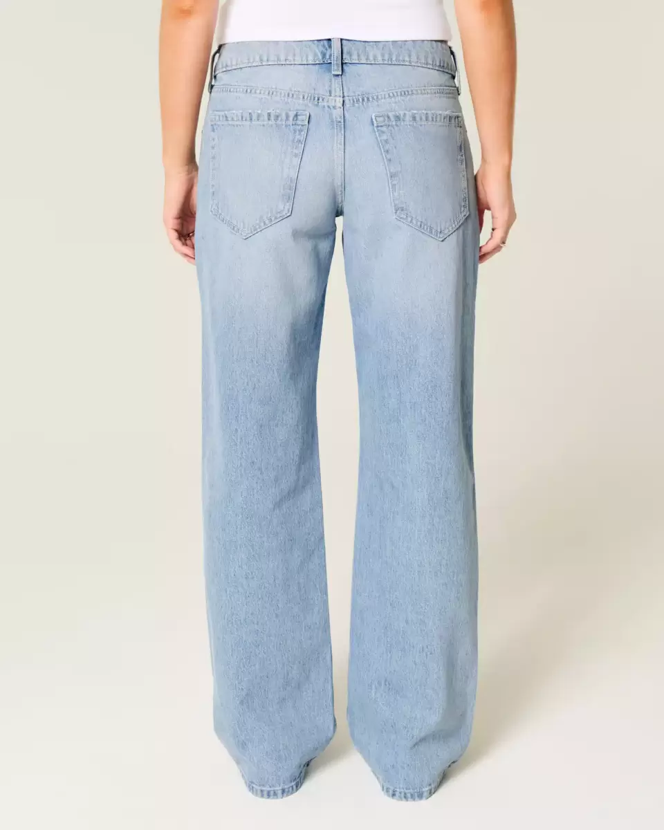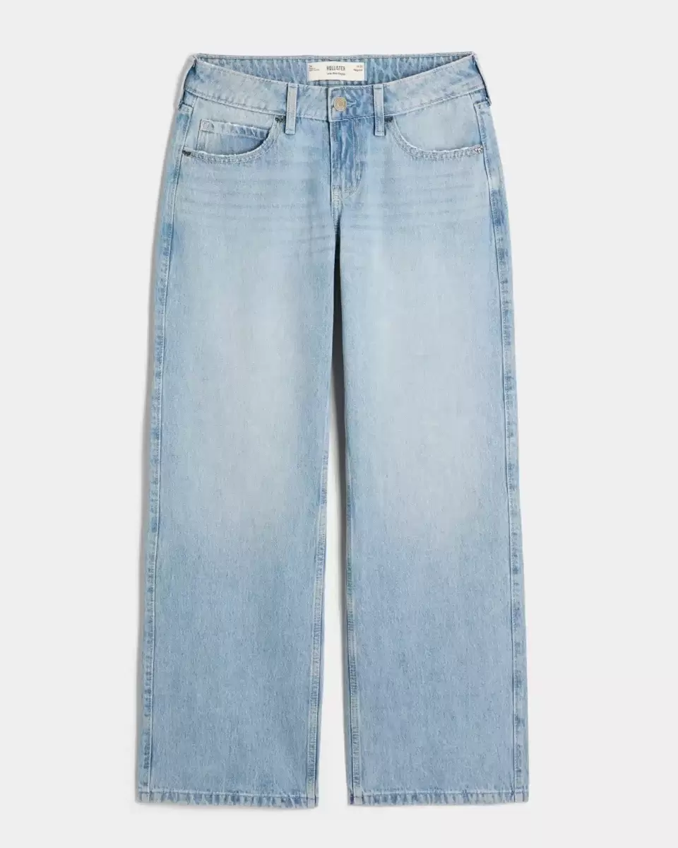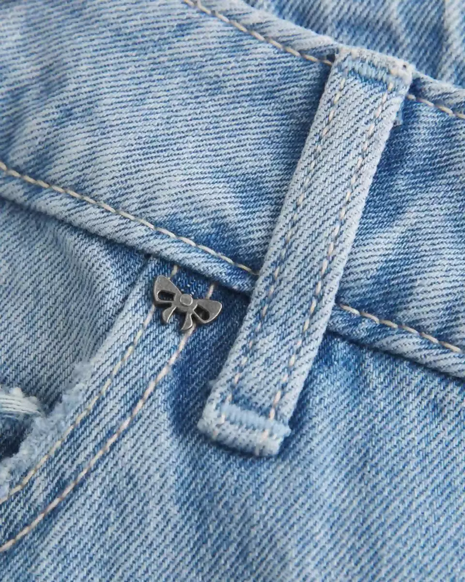 Comfortable denim jeans in a light wash, designed with a baggy leg and flattering low-rise waist. Cute metal studded bow details, fading, whiskering. Imported.