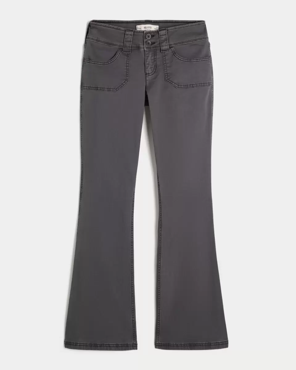 Comfortable twill pants designed with a low-rise waist, slim leg and boot hem. Pockets, back flap pockets with button closure. Imported.