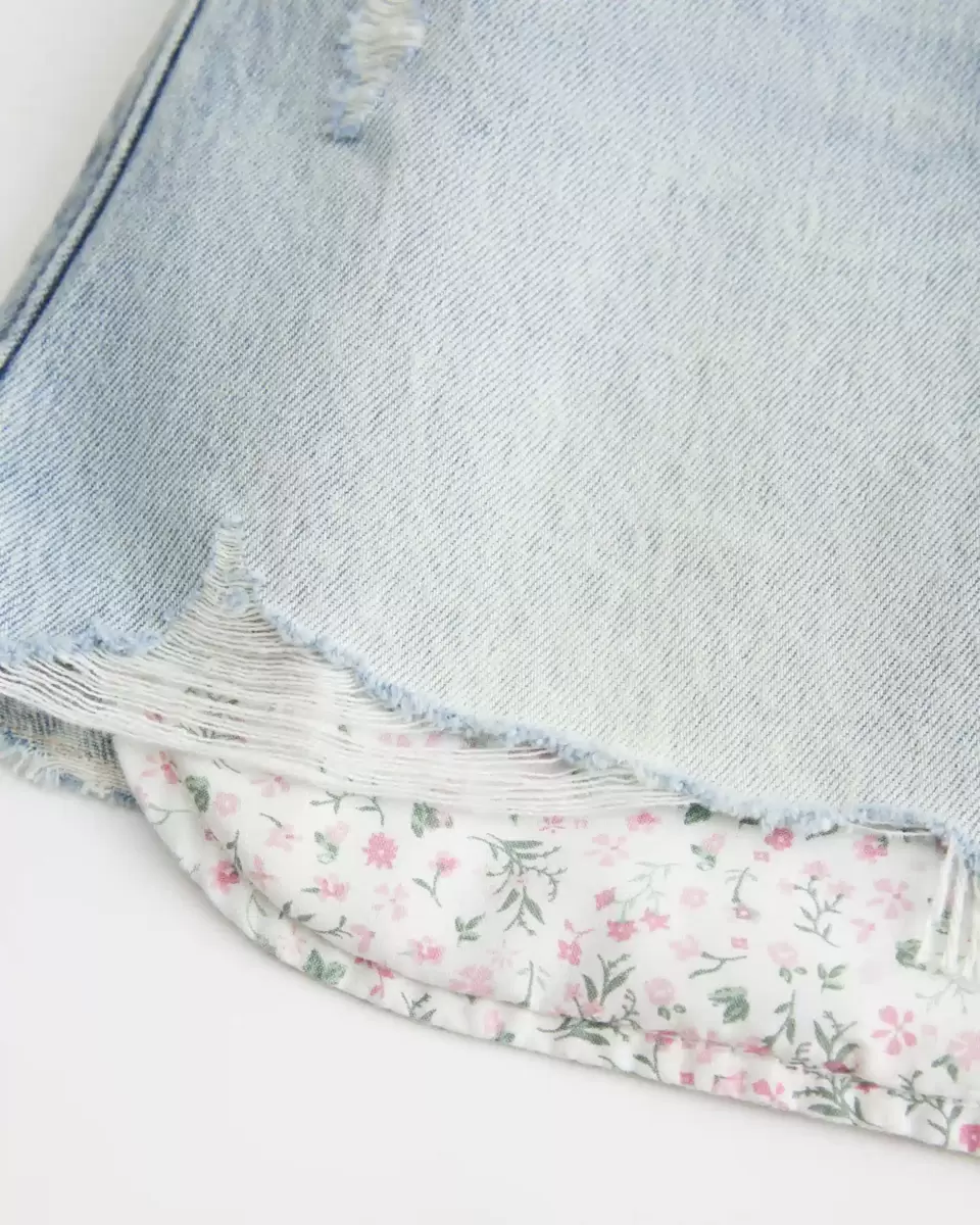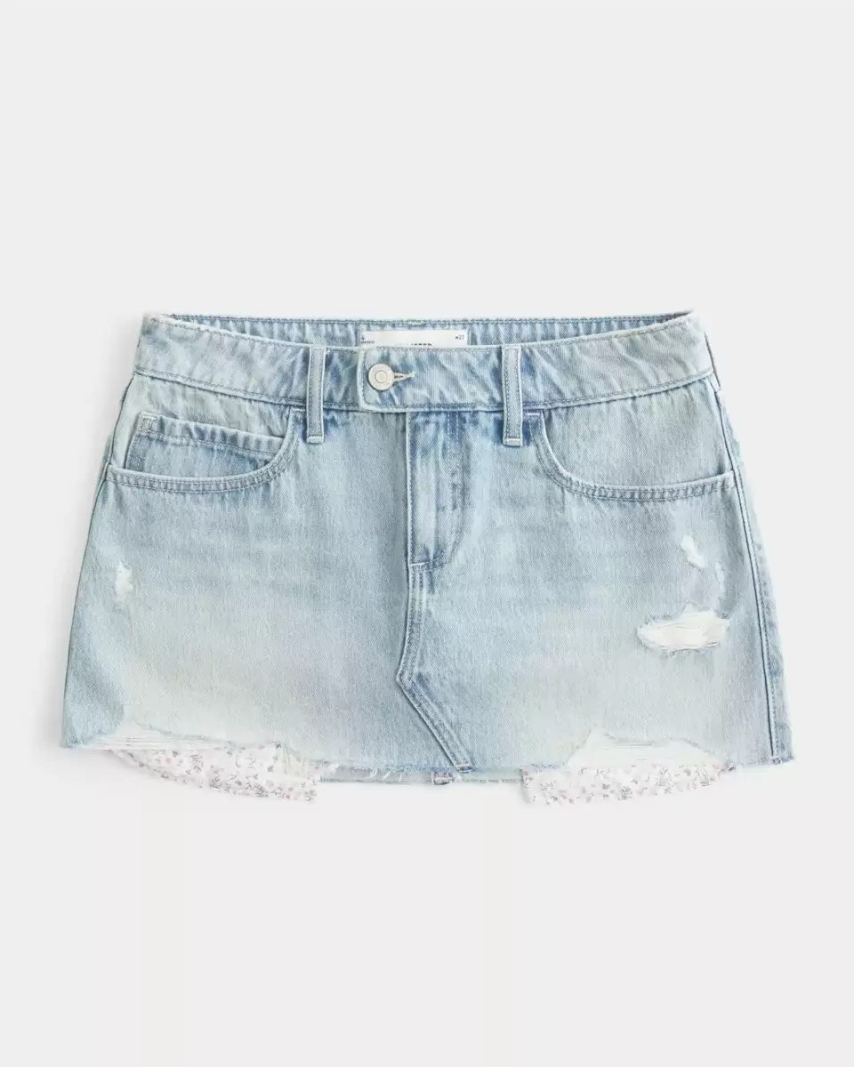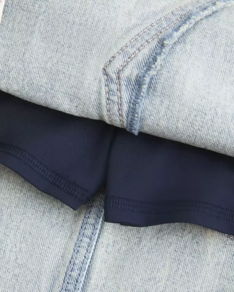 A cute denim mini skort designed with a low-rise waist and hidden knit shorts. Light wash with printed floral pockets peeking out. Imported.