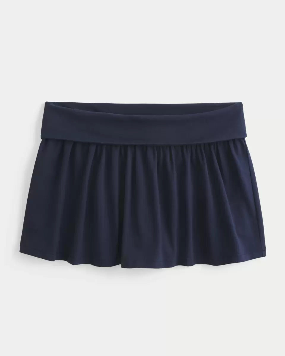 This cute mini skort is designed with a low-rise waist and features hidden knit shorts. Soft and stretchy knit fabric with an adjustable foldover waistband. Imported.