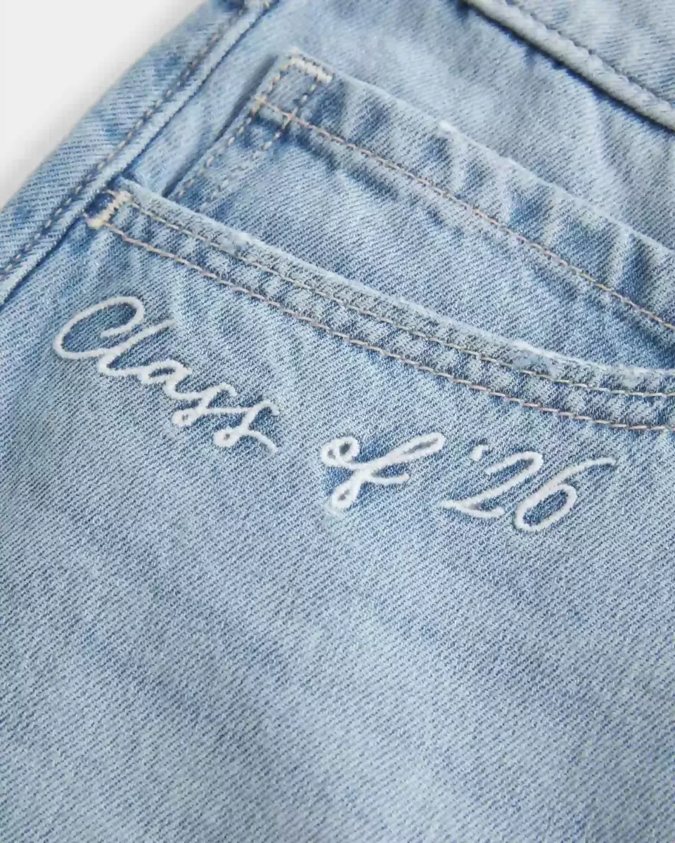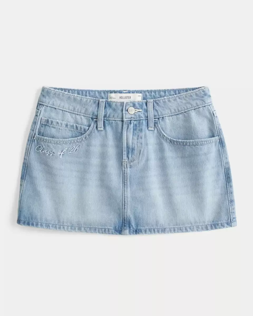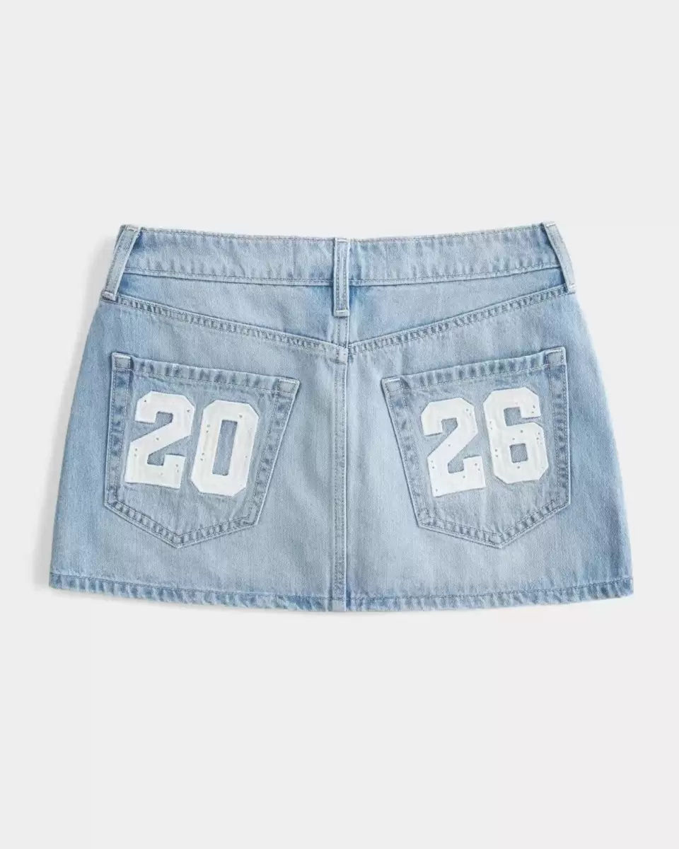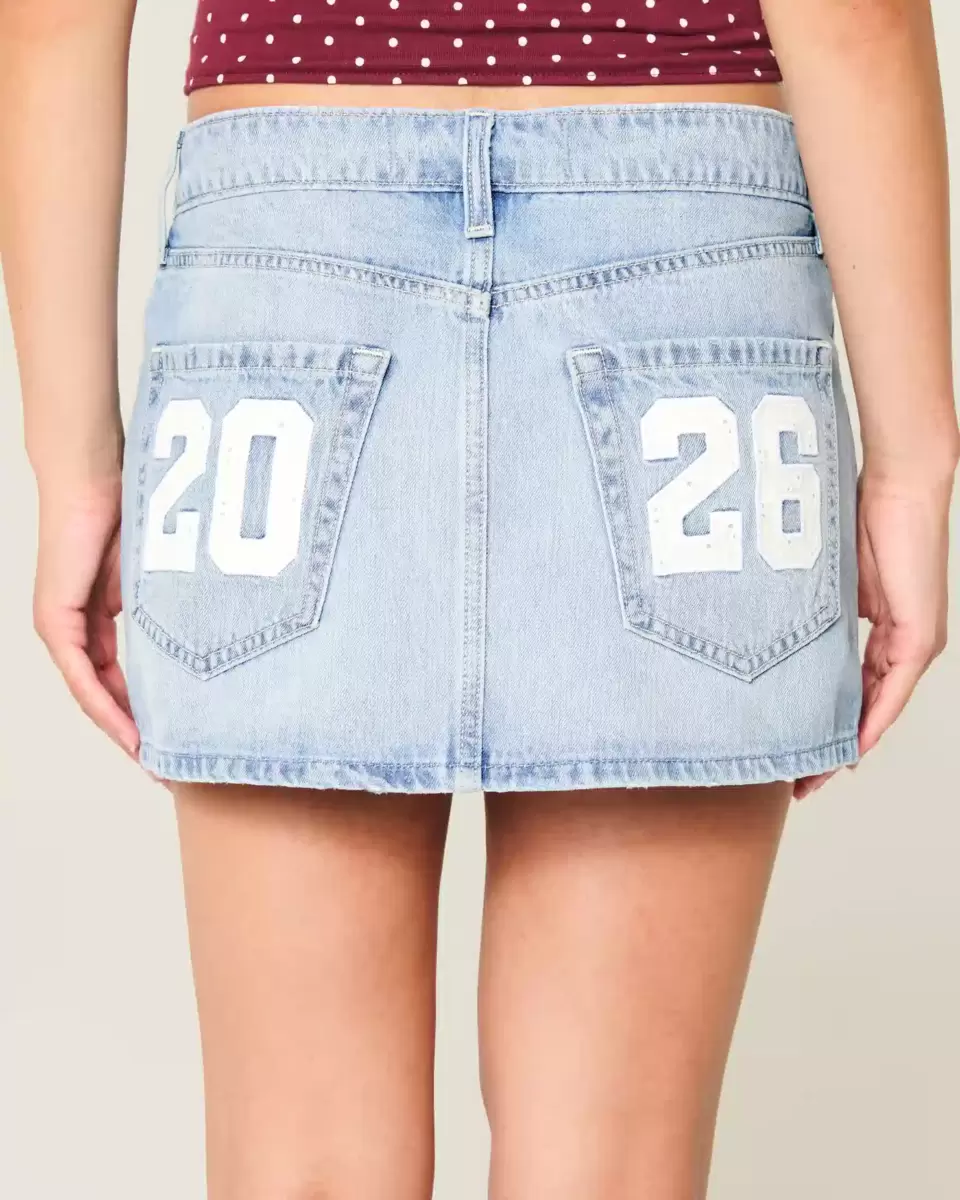 A cute and comfy denim mini skort in a medium wash, designed with a low-rise waist and hidden knit shorts. Featuring 2026 graphic applique with eyelet embroidery at the back pockets and Class of ’26 graphic embroidery at the front. Fading, whiskering. Imported.
