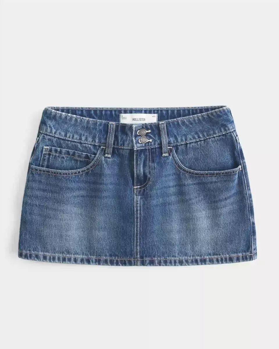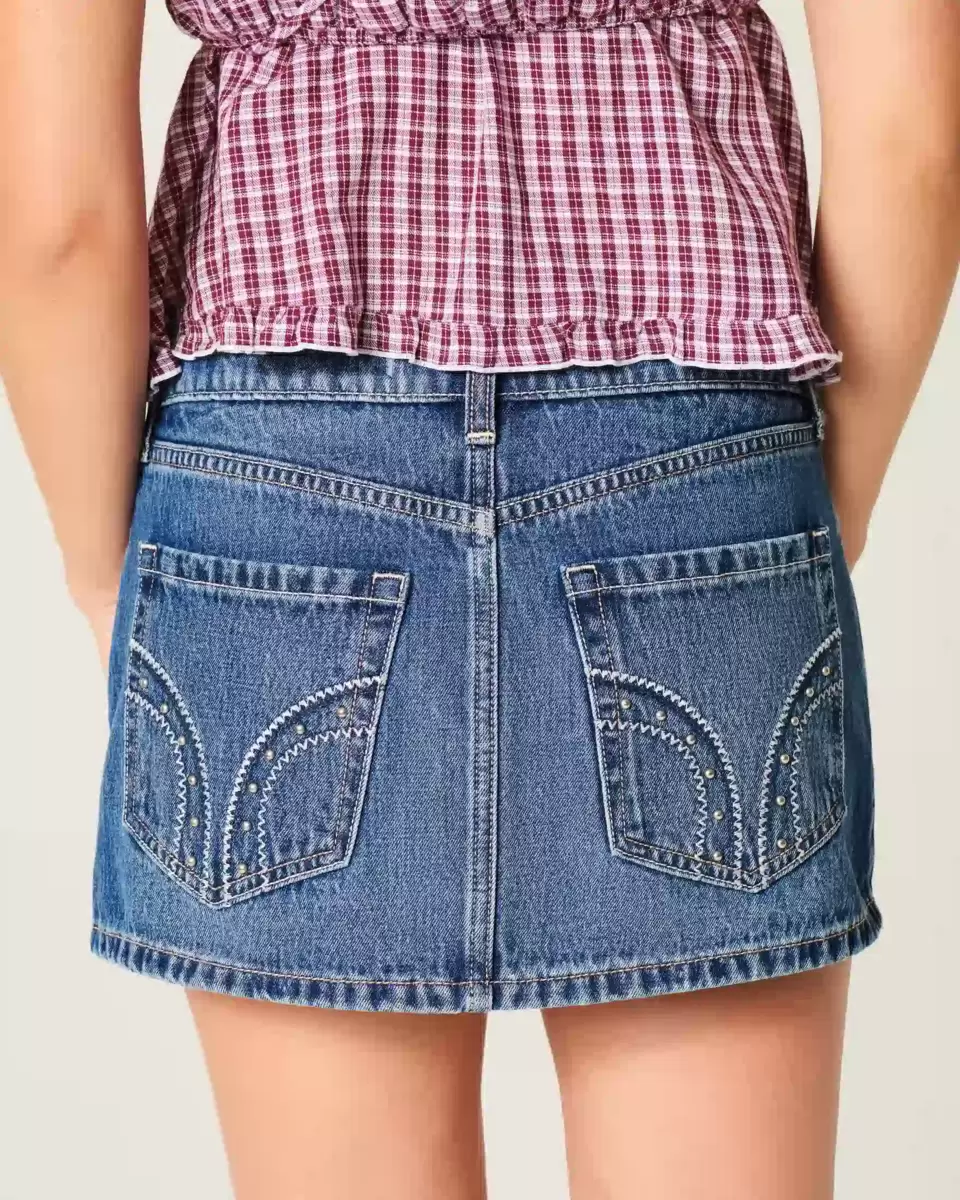 A cute denim mini skort designed with a low-rise waist and hidden knit shorts. Medium wash with fading and whiskering. Stud details on the back pockets. Imported.