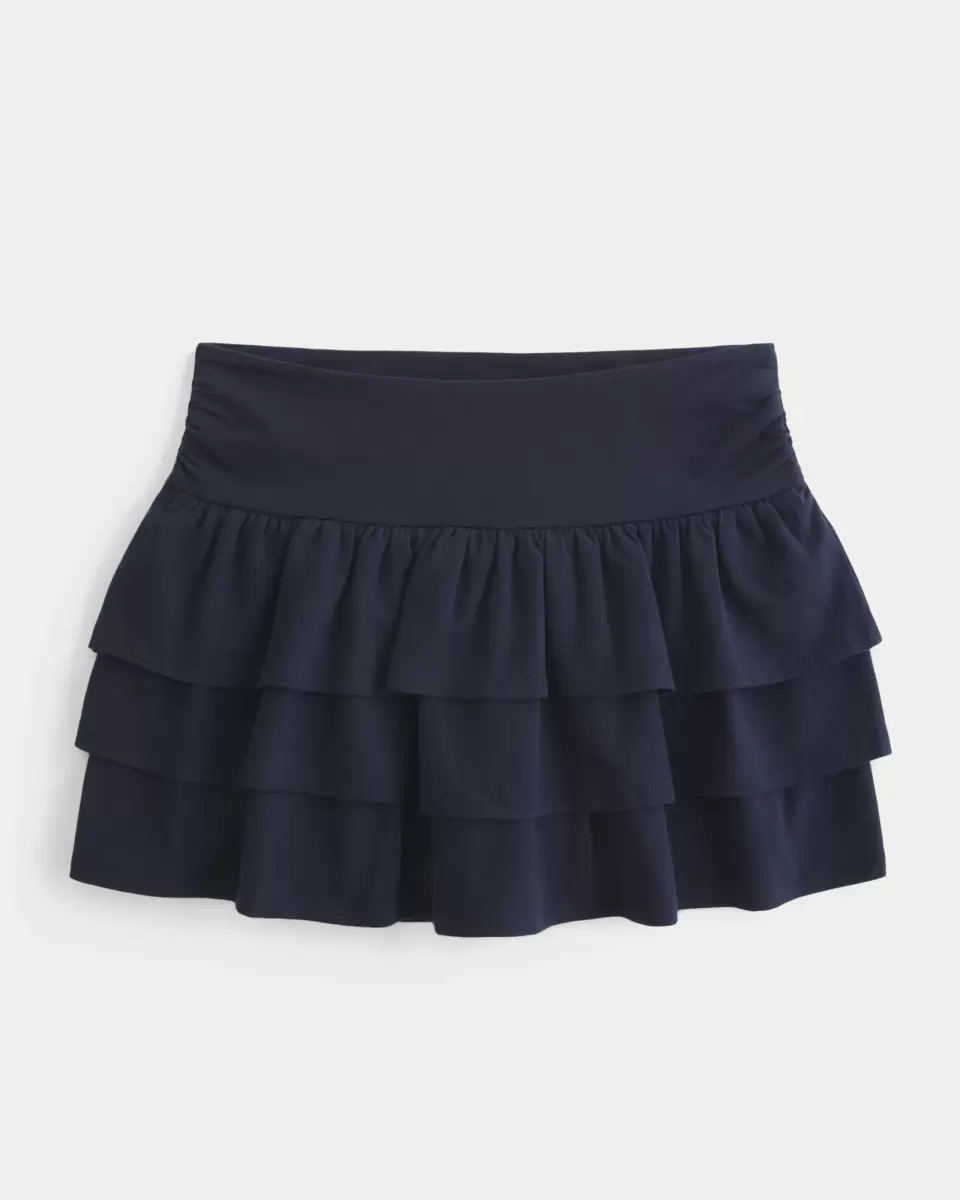 This cute mini skort is designed with a mid-rise waist and features hidden knit shorts with a side phone pocket. Soft and stretchy knit fabric, pretty ruffled tiers.