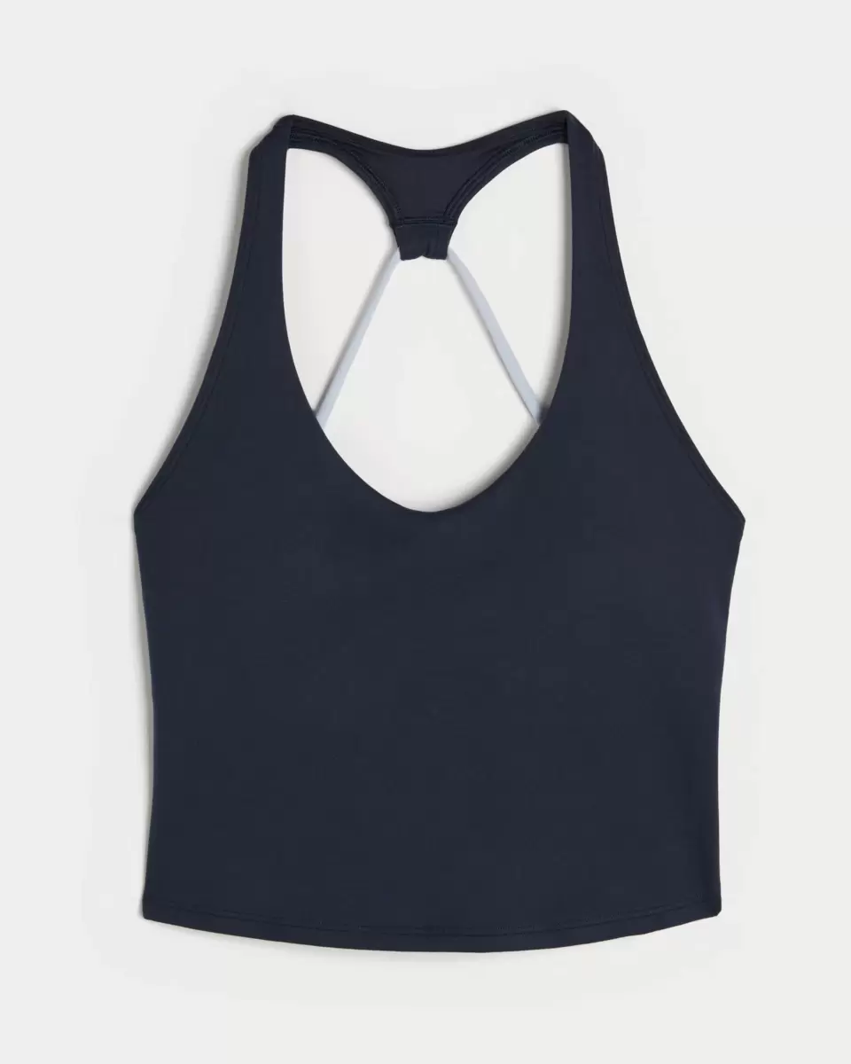 This super comfy halter tank is designed in our breathable, 4-way stretch, moisture-wicking Recharge fabric with a super soft, brushed feel. Built-in shelf bra with removable pads, halter straps, strappy back detail. Imported.