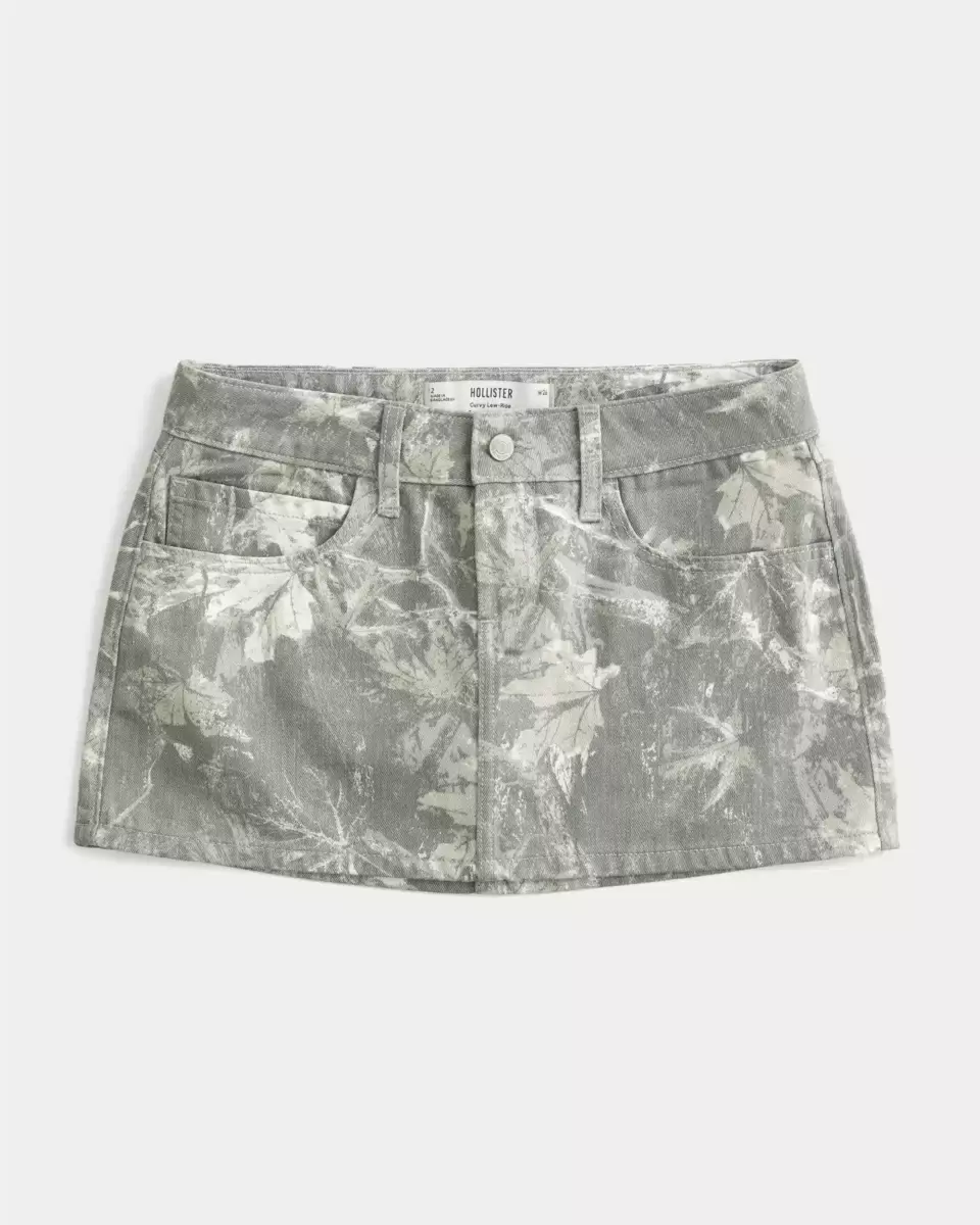 A cute denim mini skort designed with a flattering curvy low-rise waist. Hidden knit shorts, camo pattern.