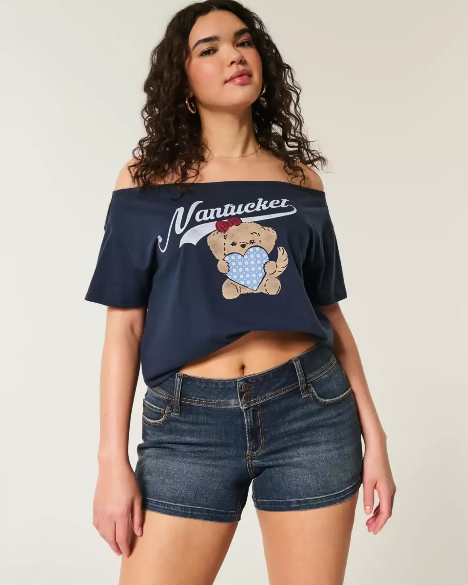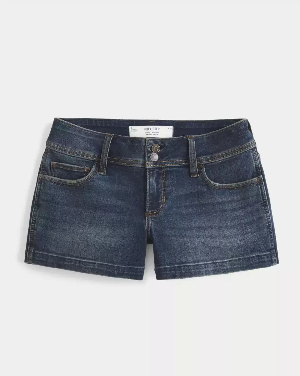 Cute and comfy denim shorts in a dark wash, designed with a curvy low-rise waist and shortie short fit. Fading, whiskering. Imported.