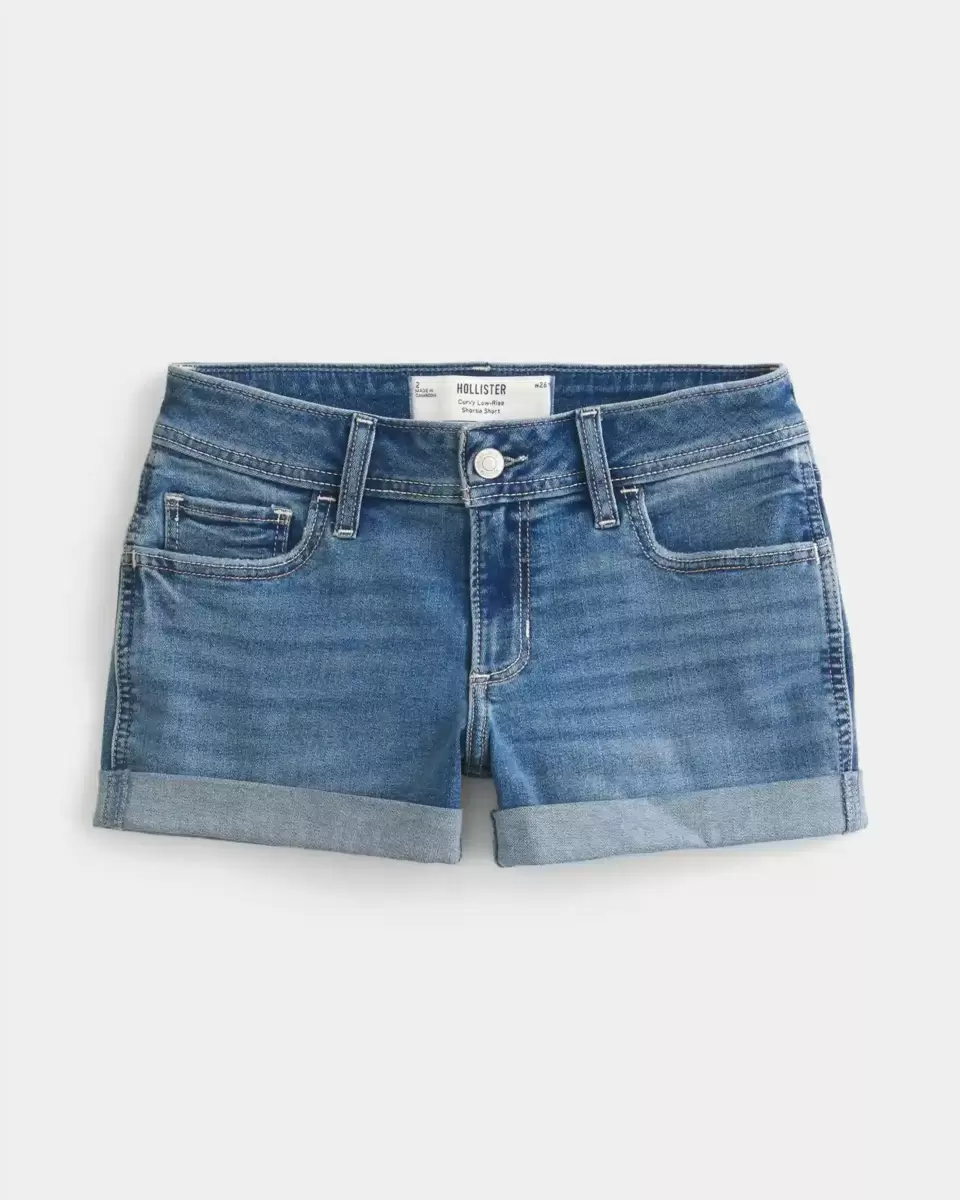 Cute and comfy denim shorts in a medium wash, designed with a curvy low-rise waist and shortie short fit. Fading, whiskering, rolled hems. Imported.