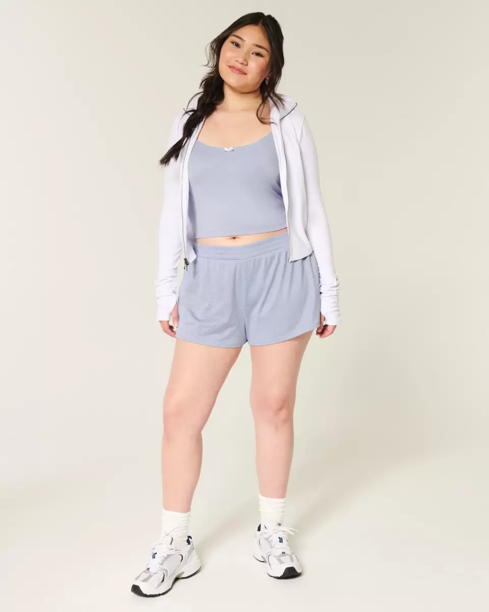 Sporty, soft active shorts in mesh fabric. Banded waist, pockets. Imported.