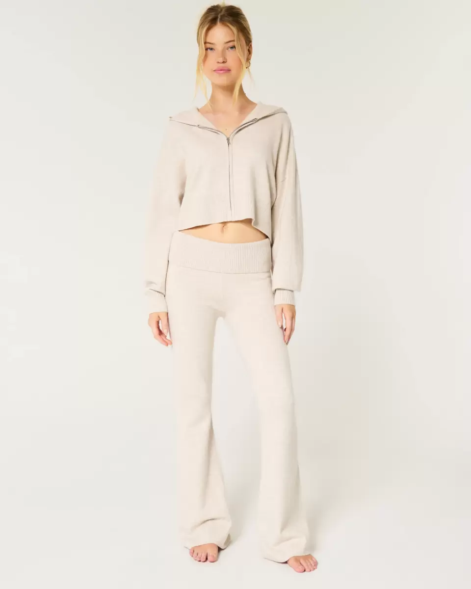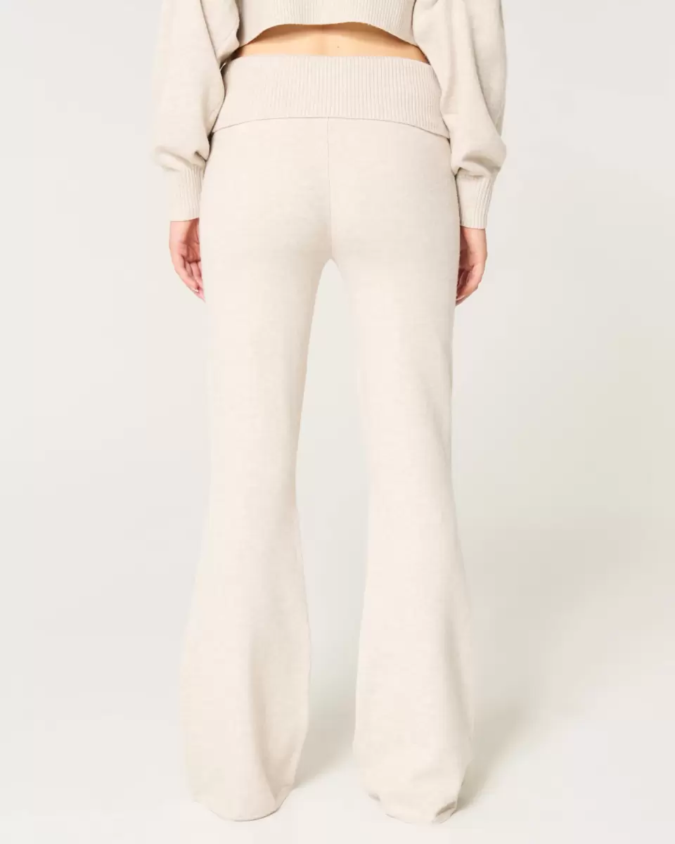 Cute and cozy pants in super soft sweater-knit fabric designed with a flared silhouette from knee to hem. Foldover waist.