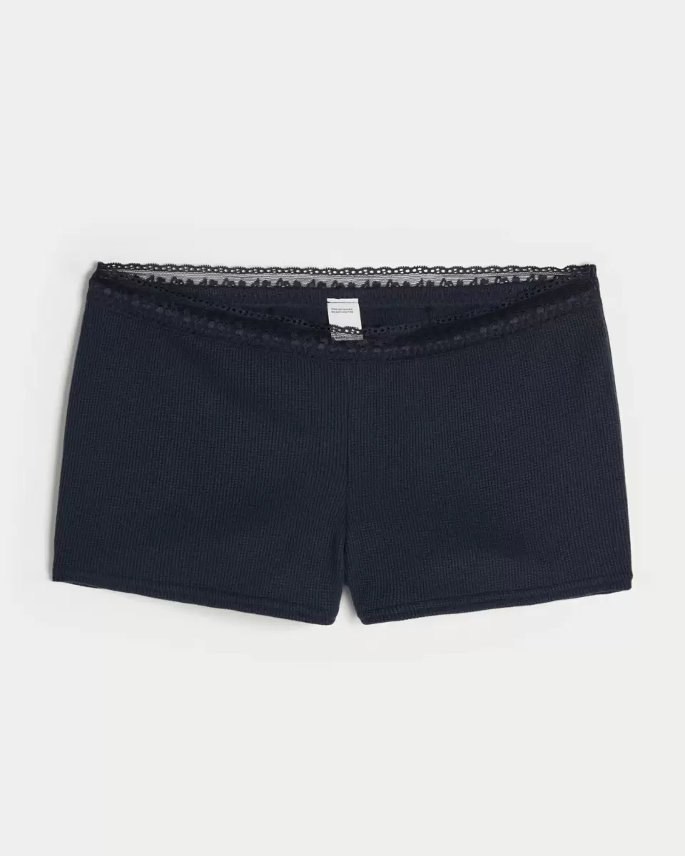 Super soft and comfy shortie shorts in waffle fabric with pretty lace trim at the waist. Imported.