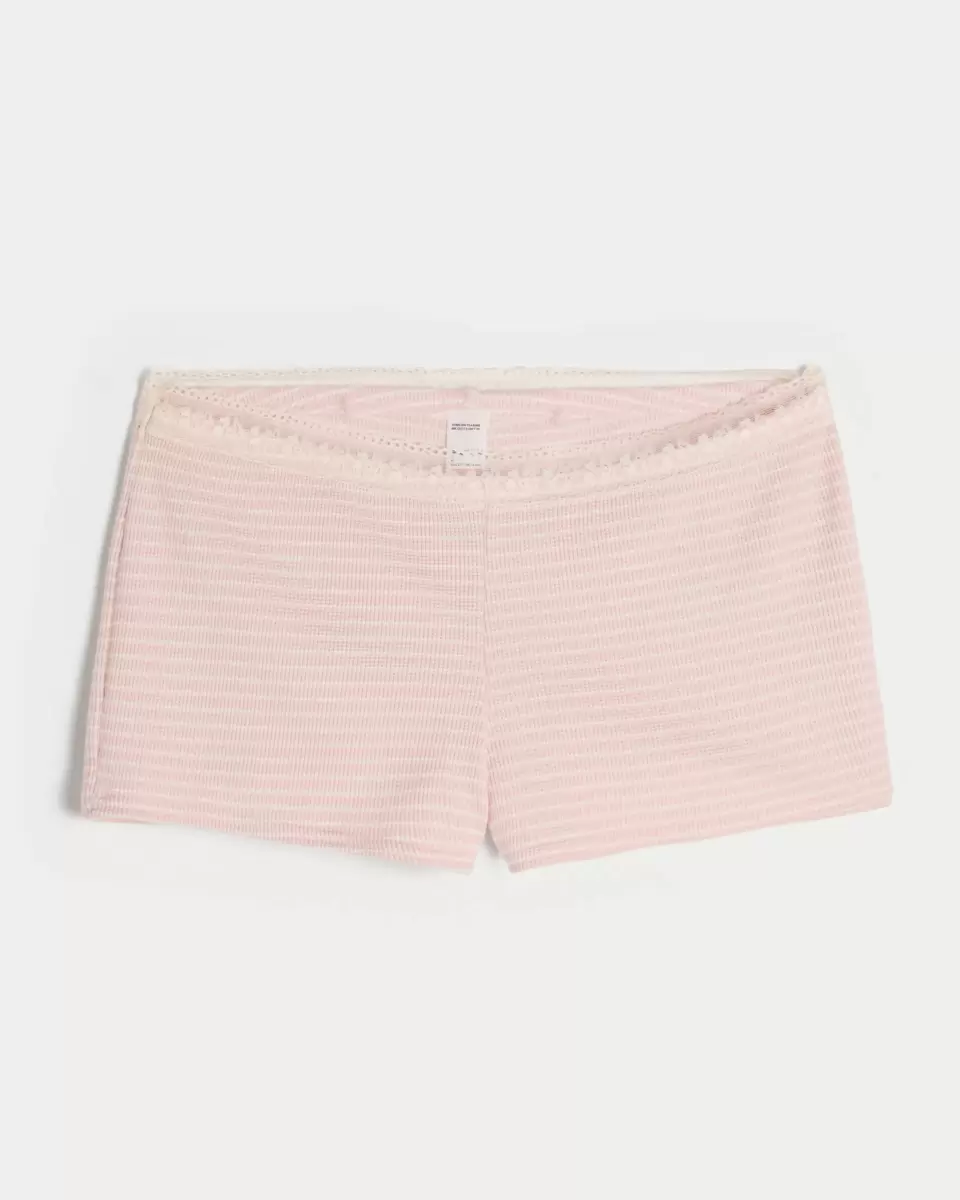 Super soft and comfy shortie shorts in waffle fabric with pretty lace trim at the waist. Imported.