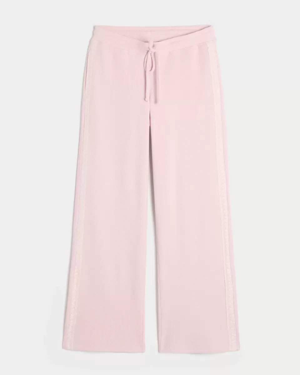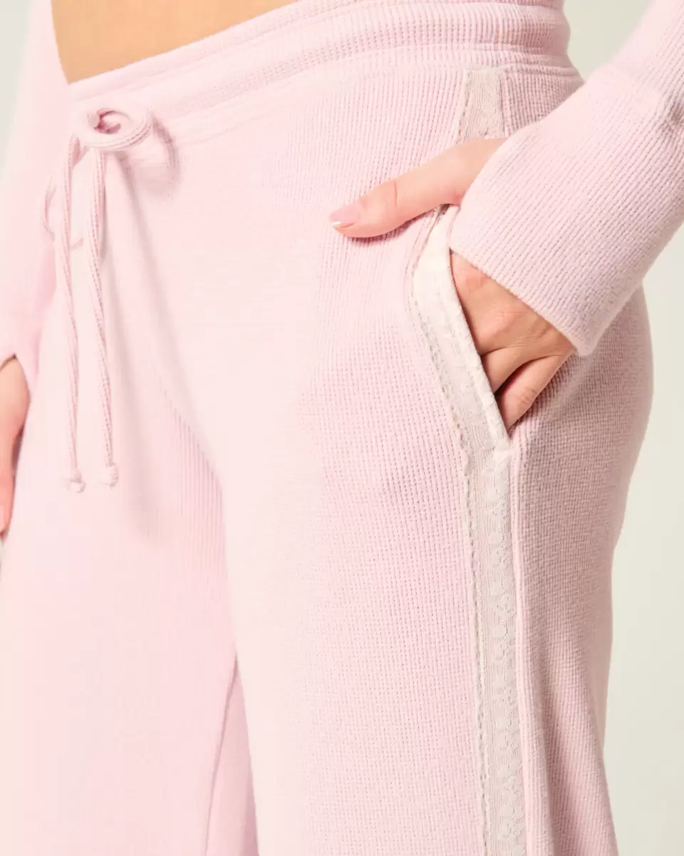 Super soft pants in waffle fabric, designed with a straight leg and drawstring waist. Pretty lace details, pockets. Imported.