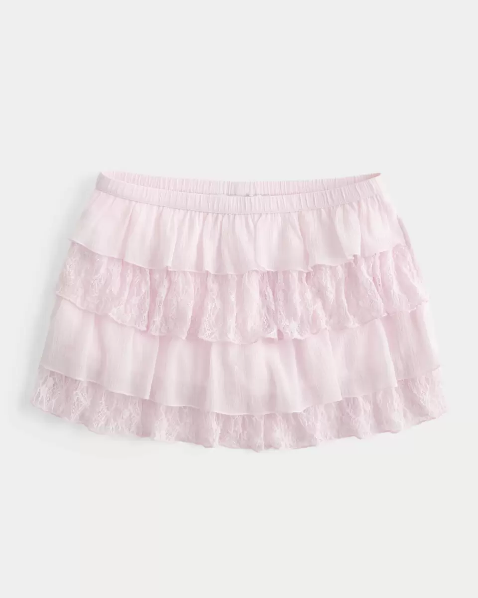 A cute and comfy mini skort with built-in shorts and a pull-on waistband. Tiered detailing with chiffon and lace fabric. Imported.
