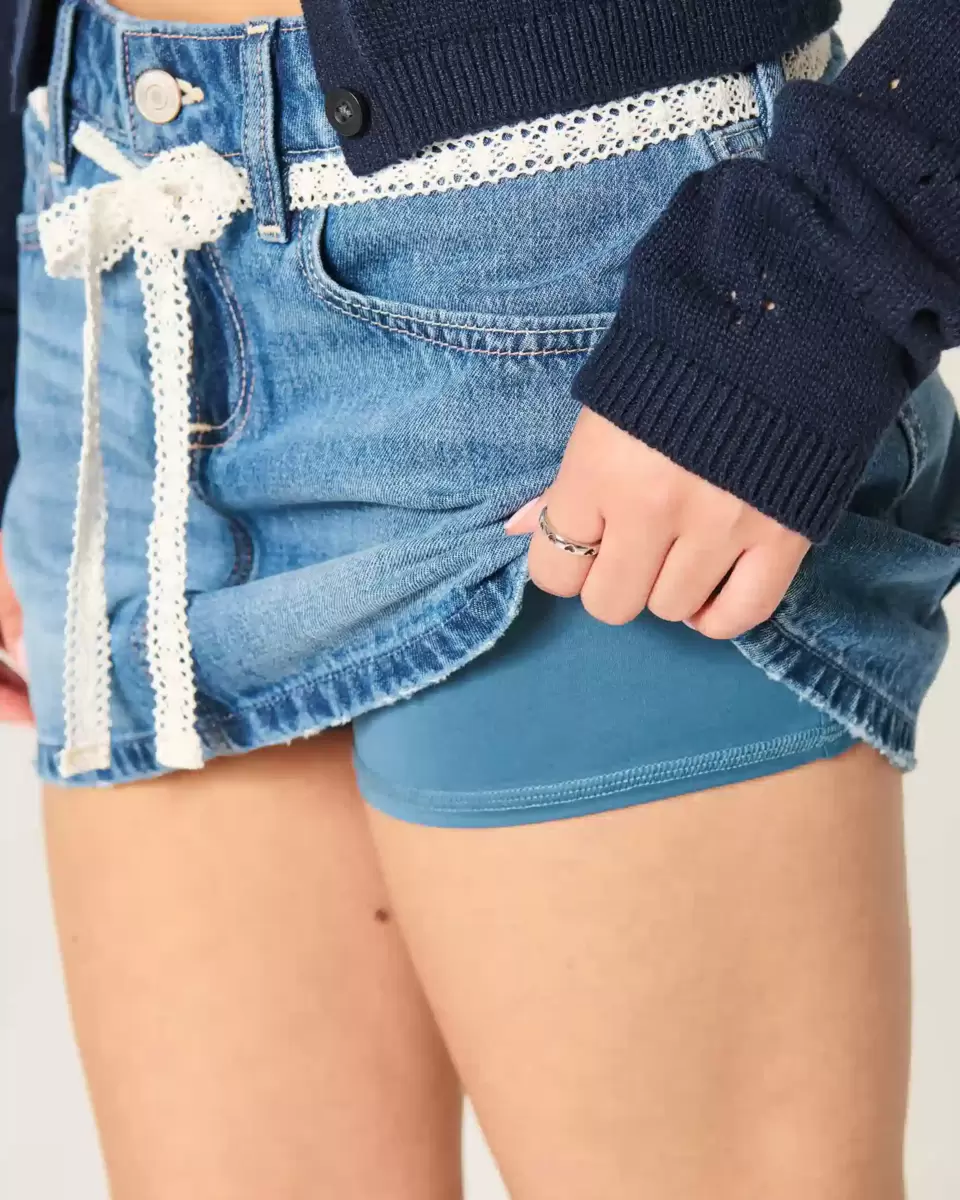 A cute denim mini skort designed with a low-rise waist and hidden knit shorts. Removable and adjustable lace waist tie detail.