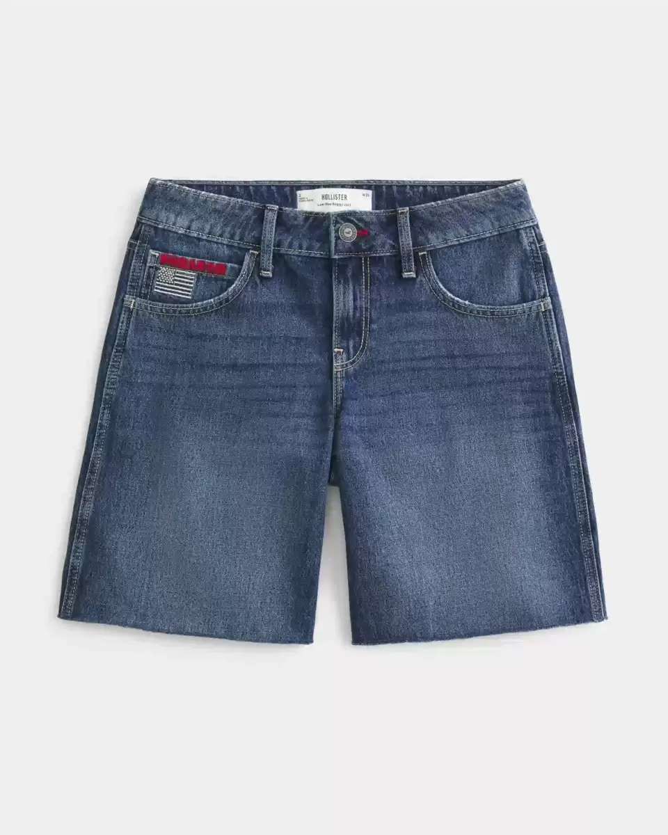 Cute denim shorts designed with a low-rise waist and baggy leg. Dark wash denim with fading and whiskering. American Flag graphic embroidery with pop-color stitching at right coin pocket. Imported.