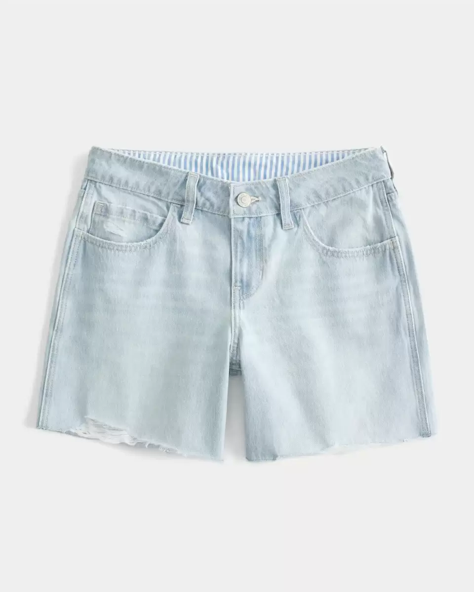 Cute and comfy denim shorts in a light wash, featuring a striped pattern at the inner waist. Frayed hems, low-rise waist, baggy fit, 5″ inseam. Imported.