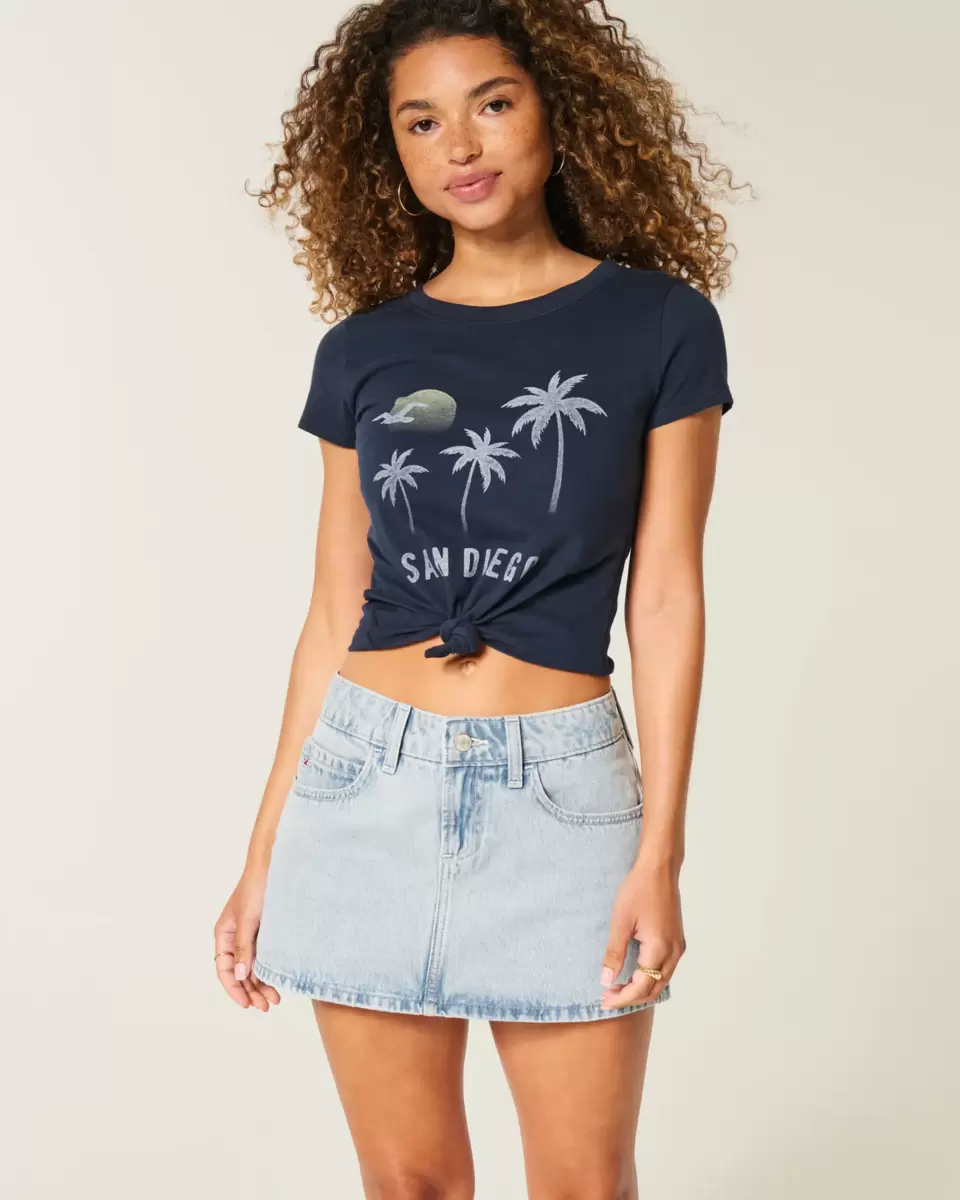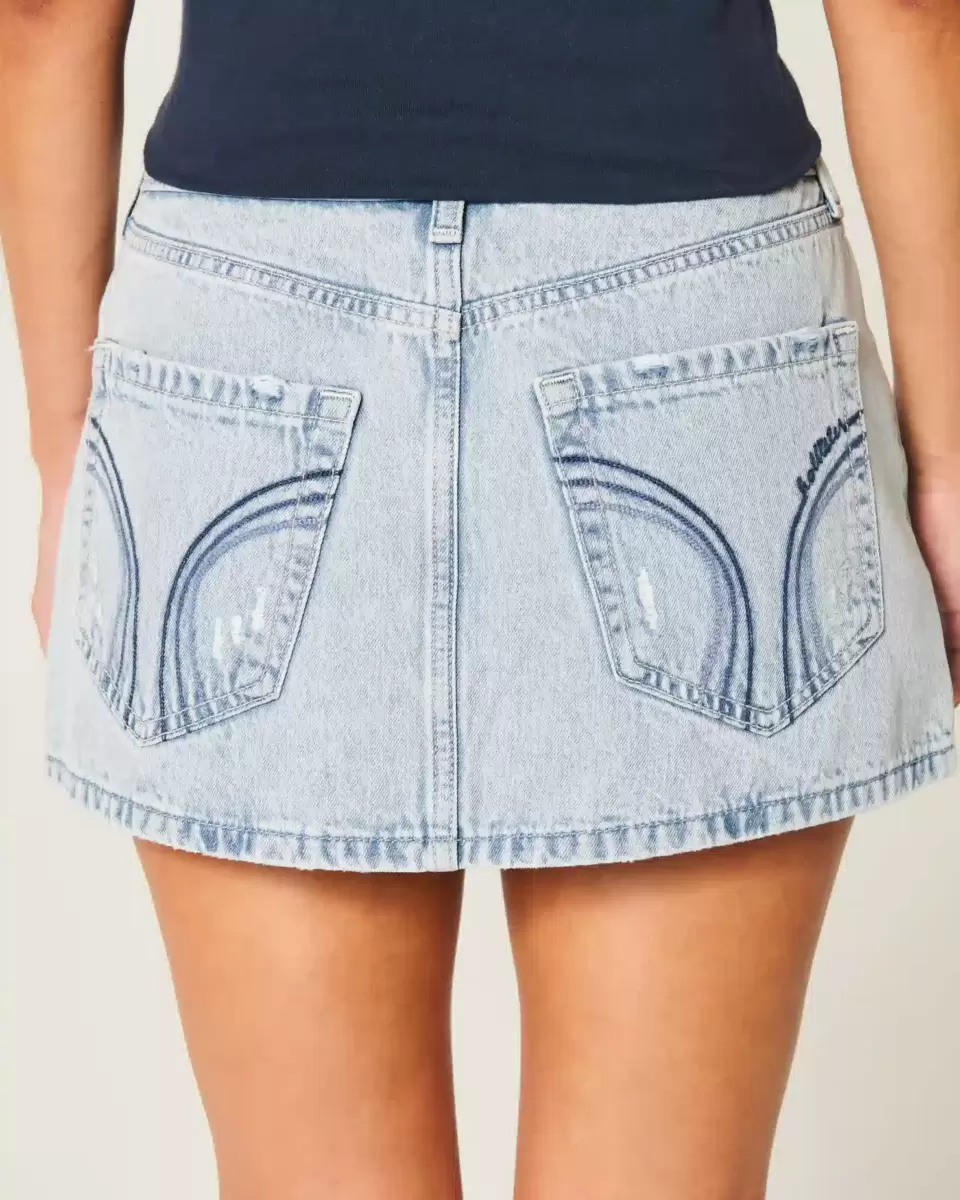 A cute denim mini skort in a light wash, designed with a low-rise waist and built-in shorts with a phone pocket. Imported.