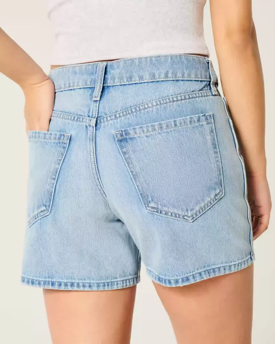 Cute and comfy denim shorts designed with a low-rise waist and baggy leg. Medium wash, floral interior waist pattern, 5″ inseam.