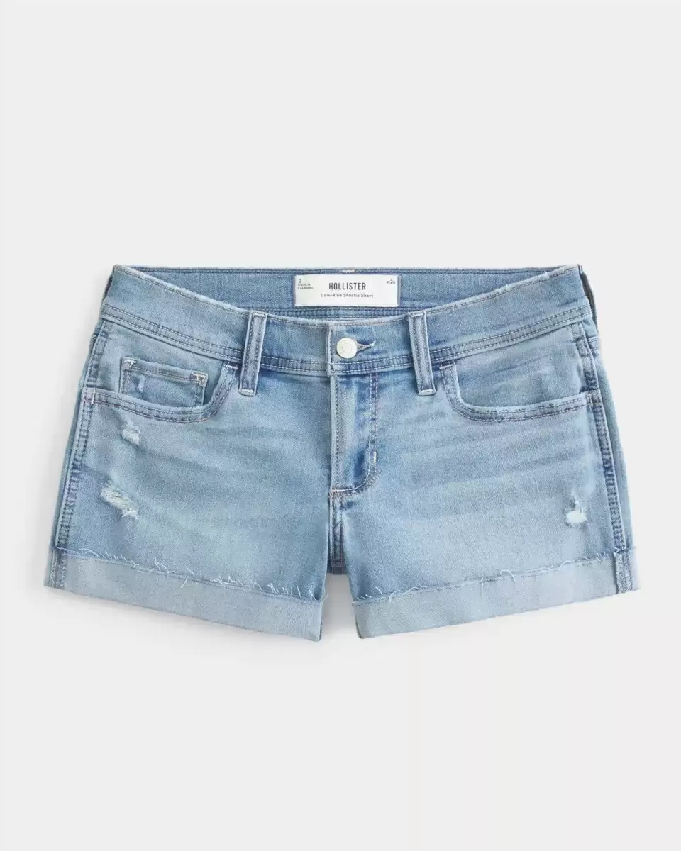 Cute and comfy denim shortie shorts in a light wash, designed with a low-rise waist. Fading, whiskering, ripped details, cuffed hems. Classic Stretch denim. Imported.