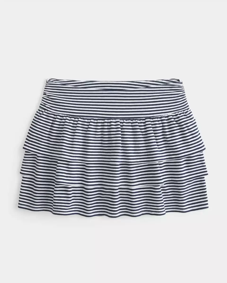 This cute mini skort is designed with a mid-rise waist and features hidden knit shorts with a side phone pocket. Soft and stretchy knit fabric, pretty ruffled tiers. Imported.