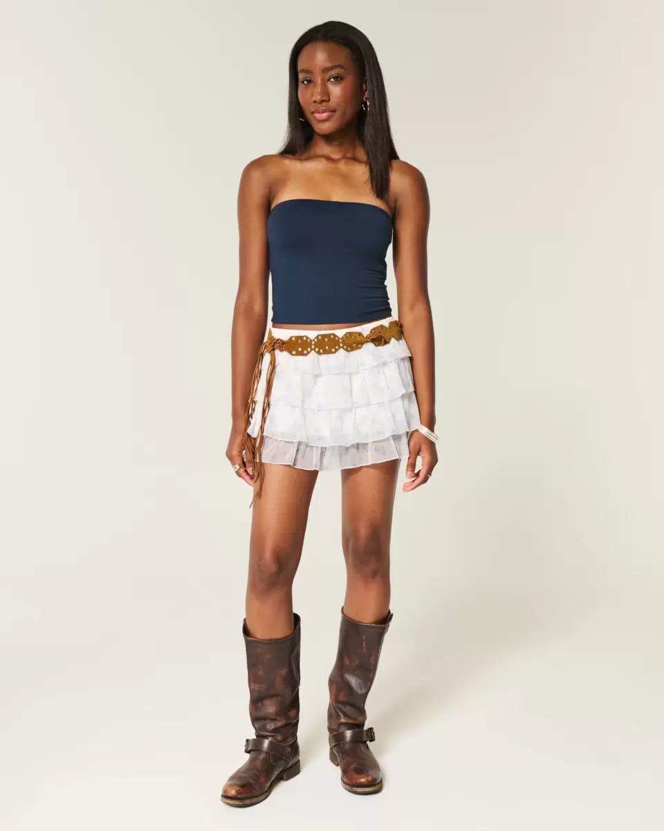 A pretty and super soft mini skort designed with a low-rise waist and ruffled tiers. Built-in knit shorts, pockets. Imported.