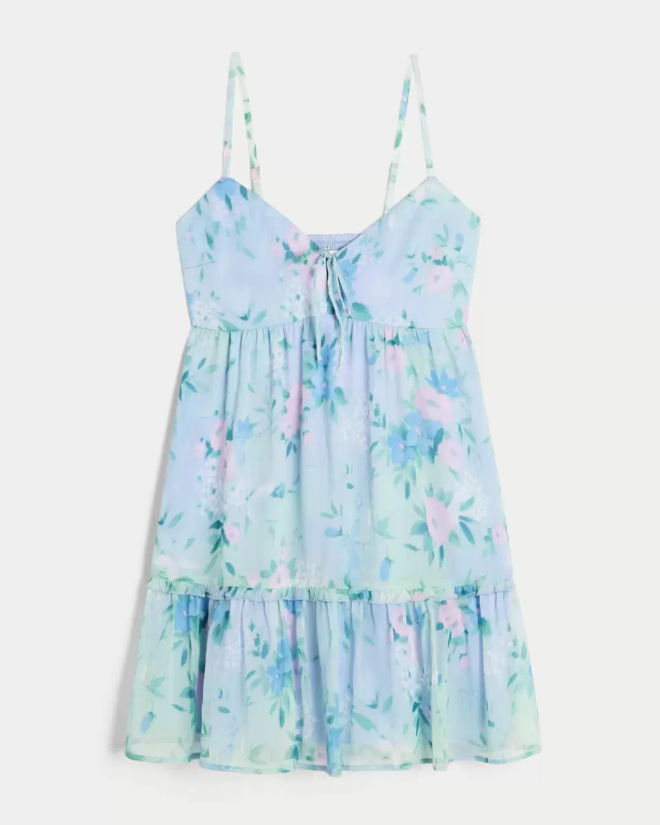 This flowy, festival-inspired mini dress features a ruffled hem and center tie detail at the neckline. Soft smocked back, adjustable straps. Imported.