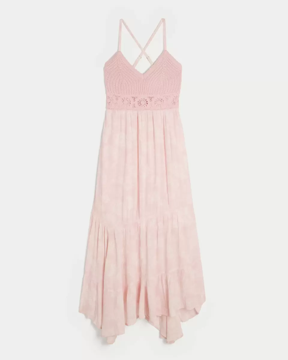 This pretty maxi-length dress features fabric mixing with a super soft crochet-style bodice and flowy woven skirt. Cute stitched patterns, asymmetrical hem, v-neck, adjustable cross-back straps, pockets. Imported.