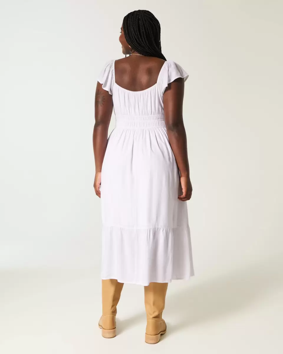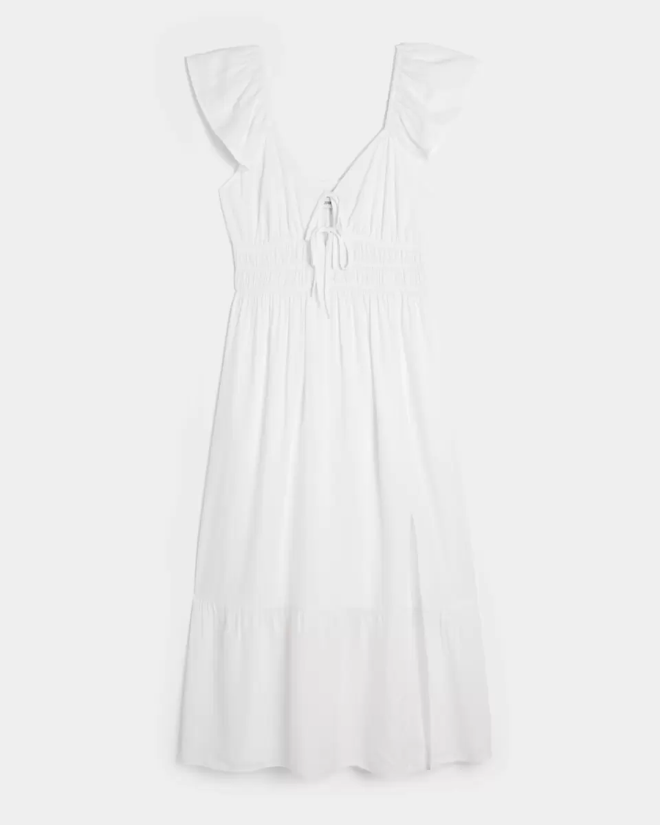 Pretty and super soft, this midi-length dress has flutter sleeves, pockets and a front tie detail. Channeled waist with double ties. Imported.