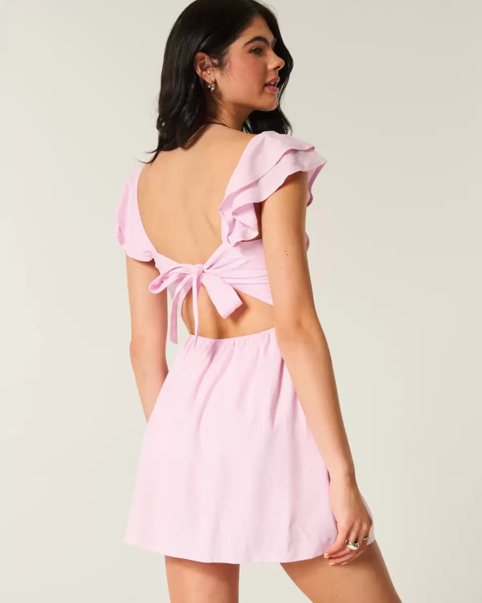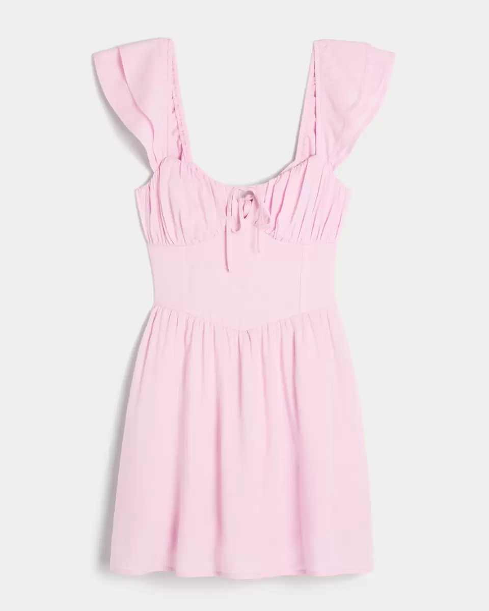 Pretty and super soft, this dress features ruched detailing through the bust, a front tie detail, and double flutter sleeves. Bra-covering back detail, flowy skirt, hidden shorts, pockets. Imported.