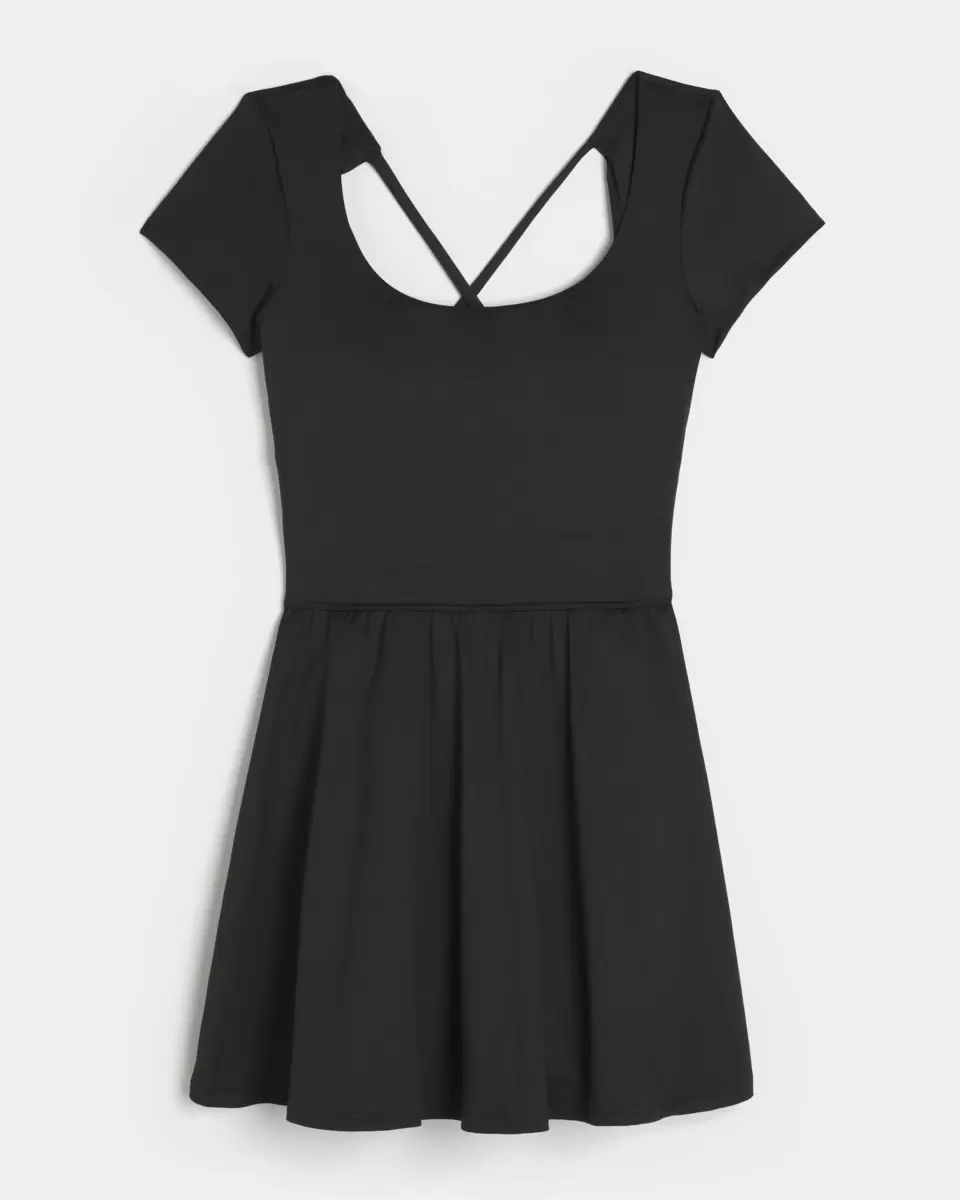 This cute and comfy active dress is designed with short sleeves and a strappy back. Built-in shelf bra, removable pads, built-in bathroom-friendly shorts with pocket. Imported.