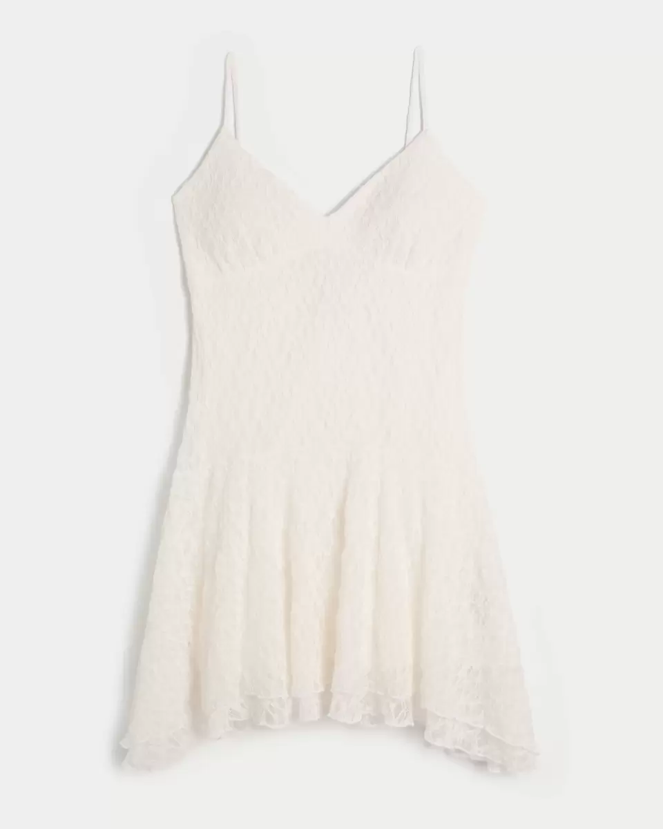 This fun dress is made with pretty and super soft lace material and features a drop waist and tiered asymmetrical hem. Open back detail, adjustable straps, removable pads. Imported.