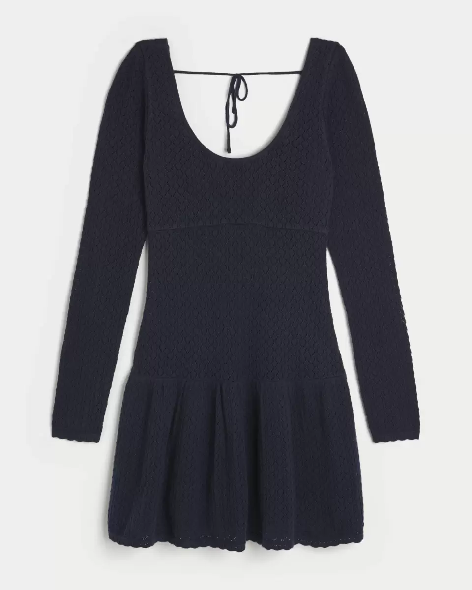 This pretty long sleeve, mini-length dress is made with super soft crochet-style pointelle fabric and features a scoop neckline and a drop waist. Open tie-back detail, with a shelf bra for support. Imported.