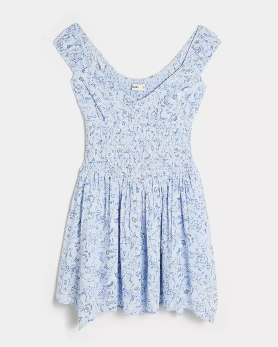 Super soft and pretty, this off-the-shoulder mini dress features pockets and a smocked waist. Asymmetrical hem. Imported.