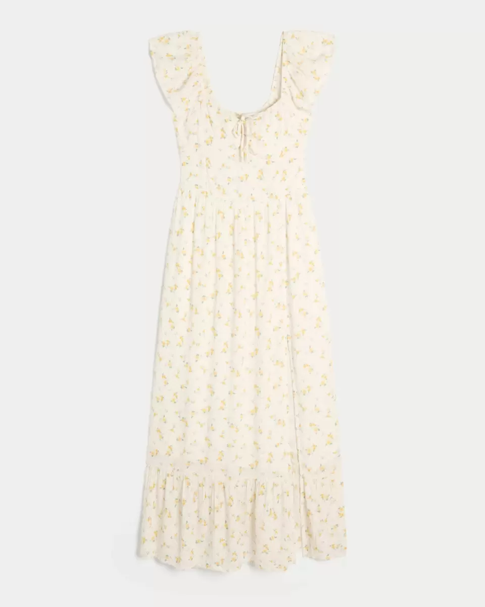 Flowy and super soft, this maxi-length dress features a split hem detail, flutter sleeves and a center tie detail at the neckline. Imported.