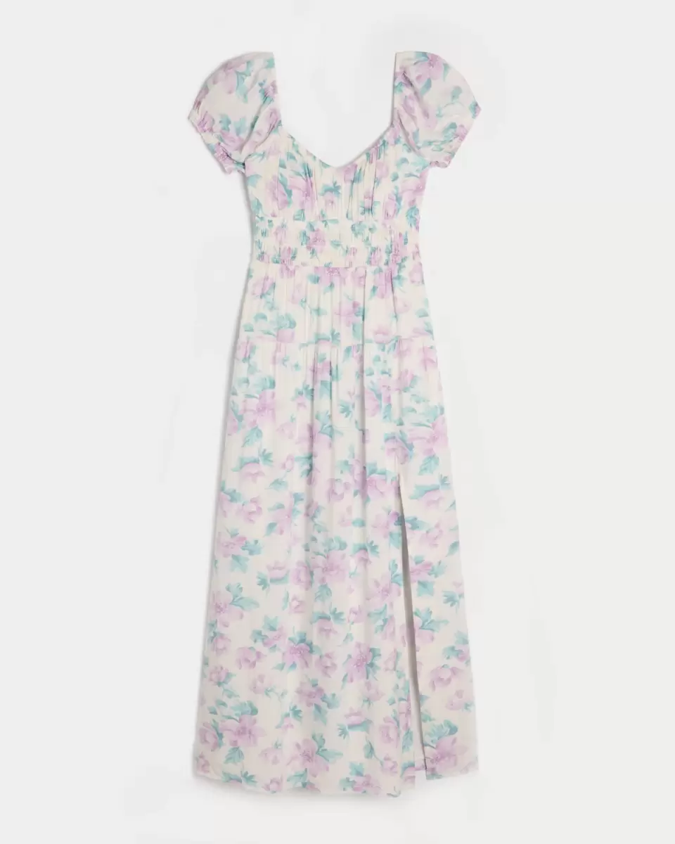 A pretty and super soft maxi-length dress with an open back detail and removable pads. Short sleeves, pockets, soft smocked waist, split hem detail. Imported.