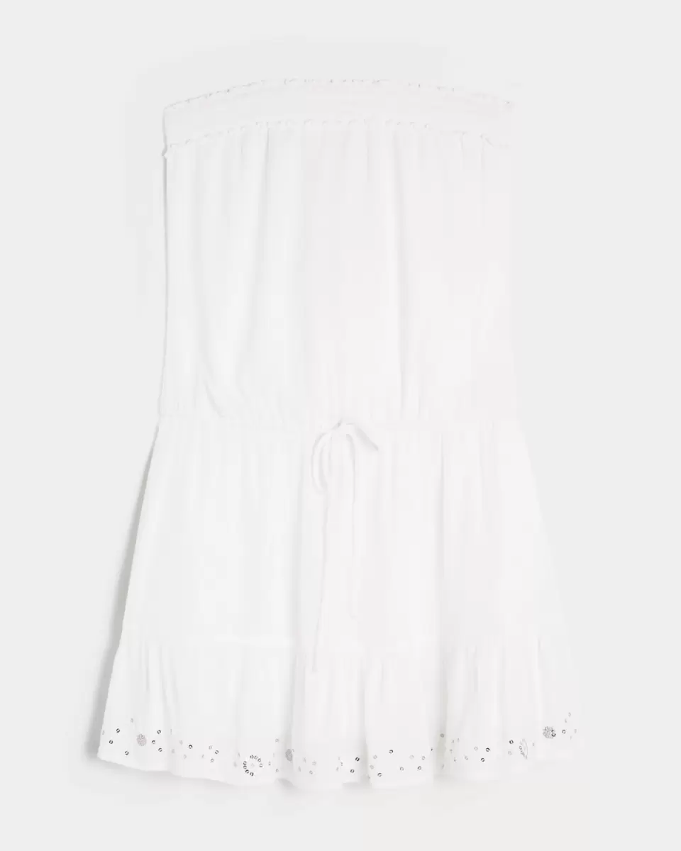Pretty and super soft, this blouson mini dress features a drawstring waist and shine details at the hem. Strapless, soft banded neckline.