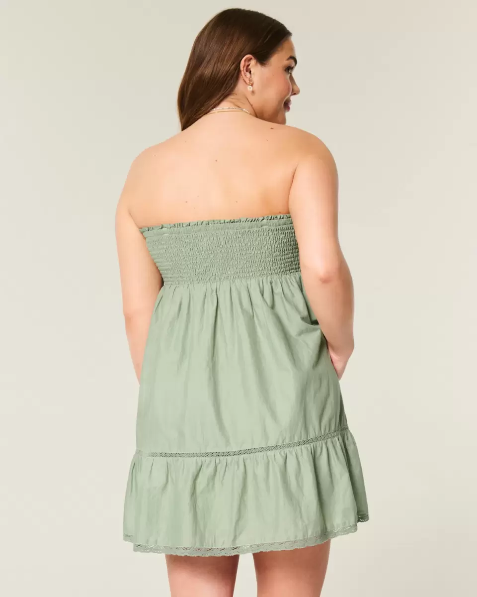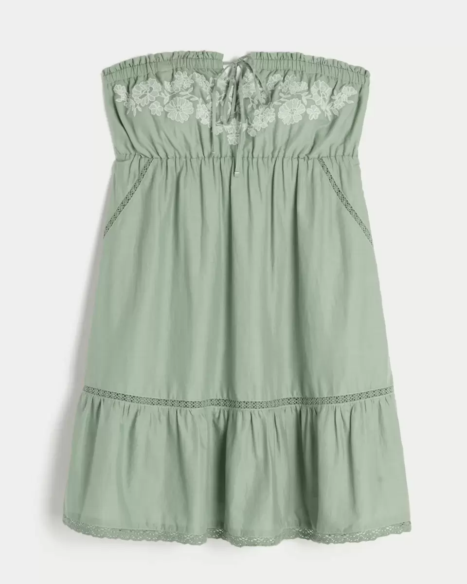 Flowy and super soft, this strapless dress features a tie at the neckline and pretty embroidered details at the bust. Pretty lace insets. Imported.