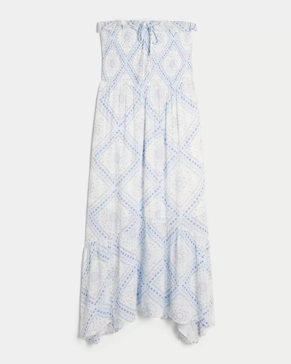 Flowy and super soft, this maxi-length dress features an asymmetrical hem and soft smocked bodice. Pretty ruffled neckline with center tie detail. Imported.