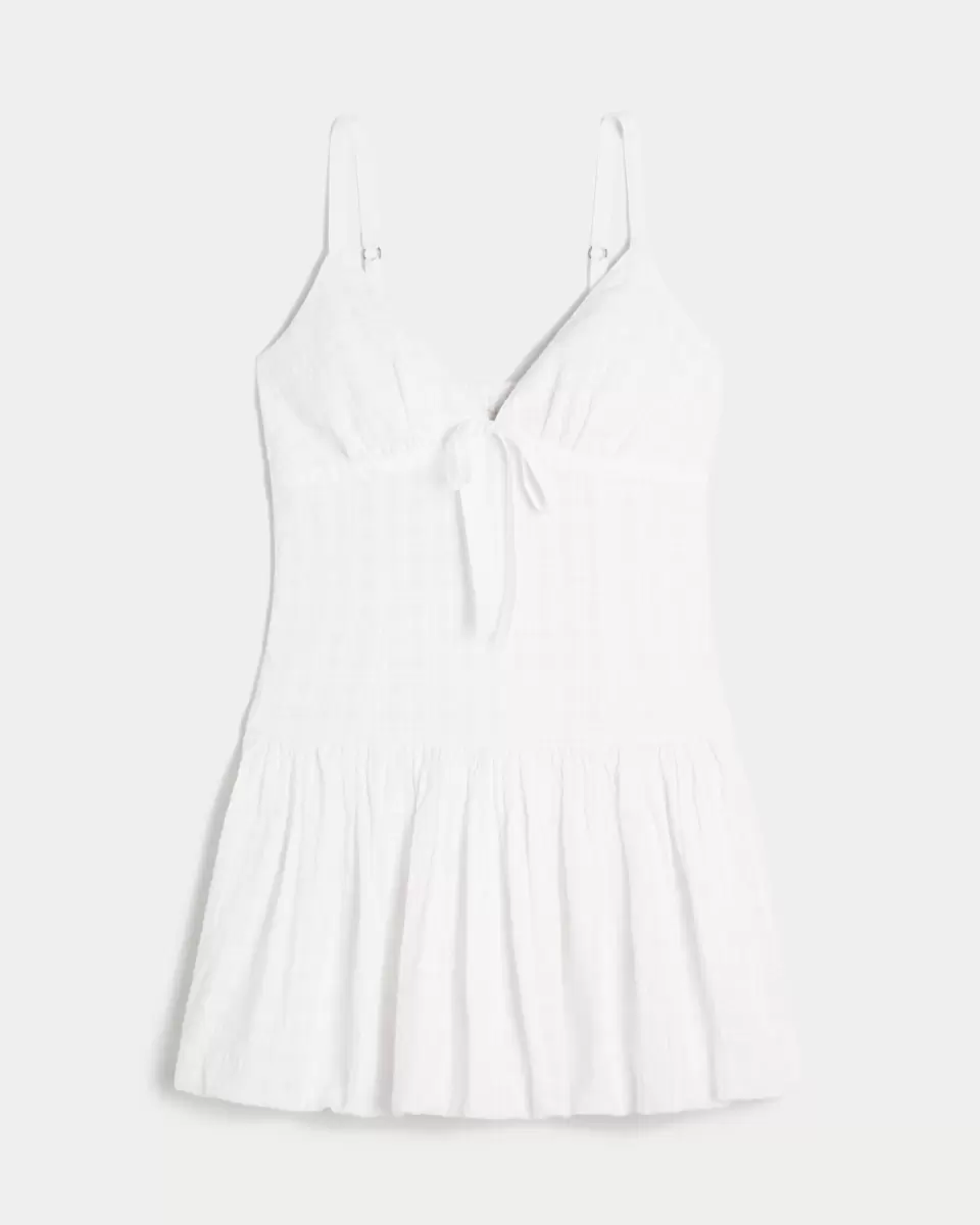 A super soft and pretty v-neck mini dress with a bubble hem, adjustable skinny straps and drop waist. Pretty tie detail, pockets, built-in shorts. Imported.