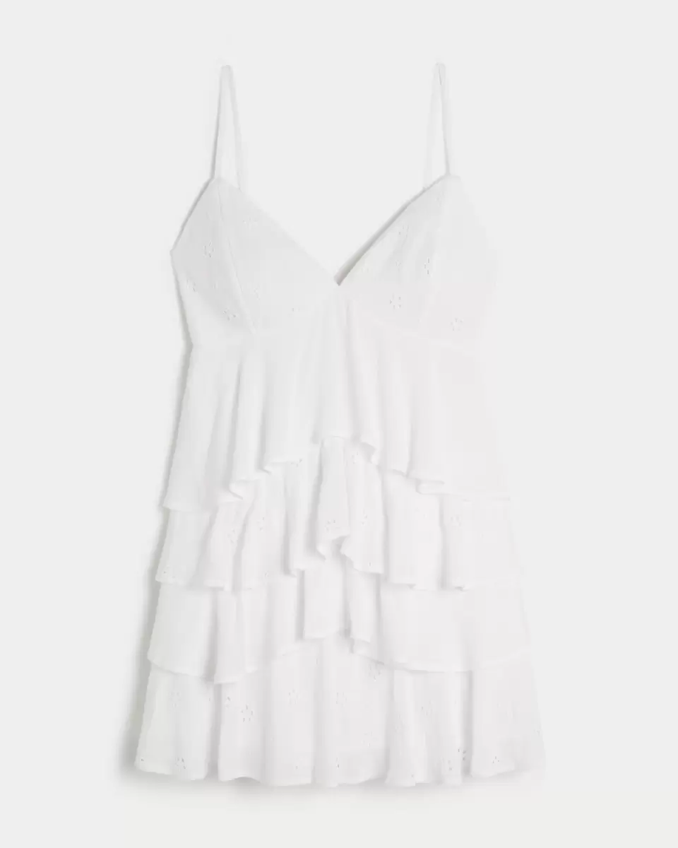 This soft and flowy mini dress is designed with a cute babydoll silhouette and features a back detail, removable pads and pockets. V-neckline, ruffled tiers, adjustable straps, textured eyelet-embroidered pattern. Imported.