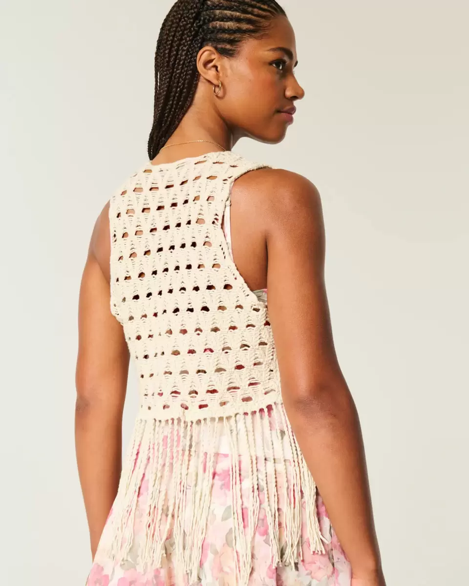 A cozy and super soft vest in crochet-style fabric with a pretty fringe hem. No closure. Easy Fit.