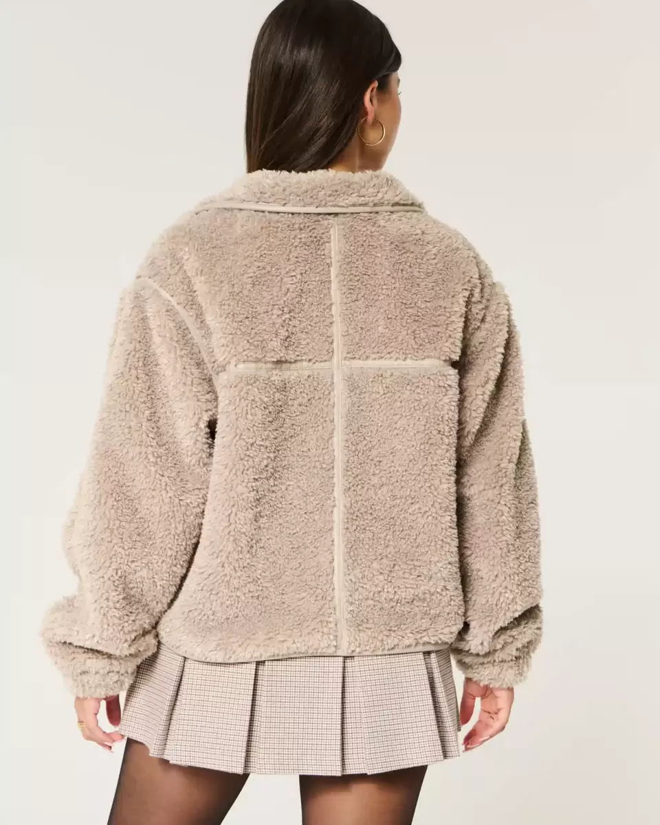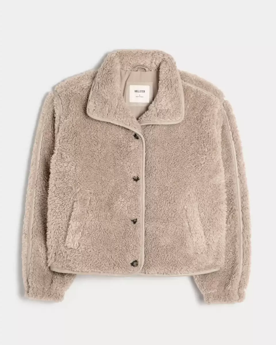 A cute jacket designed with a biker silhouette featuring super soft all-over sherpa fabric. Faux leather trim, full button closure, pockets, fully lined.